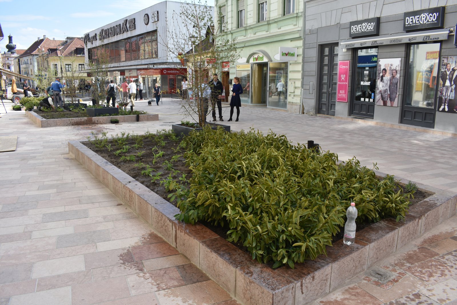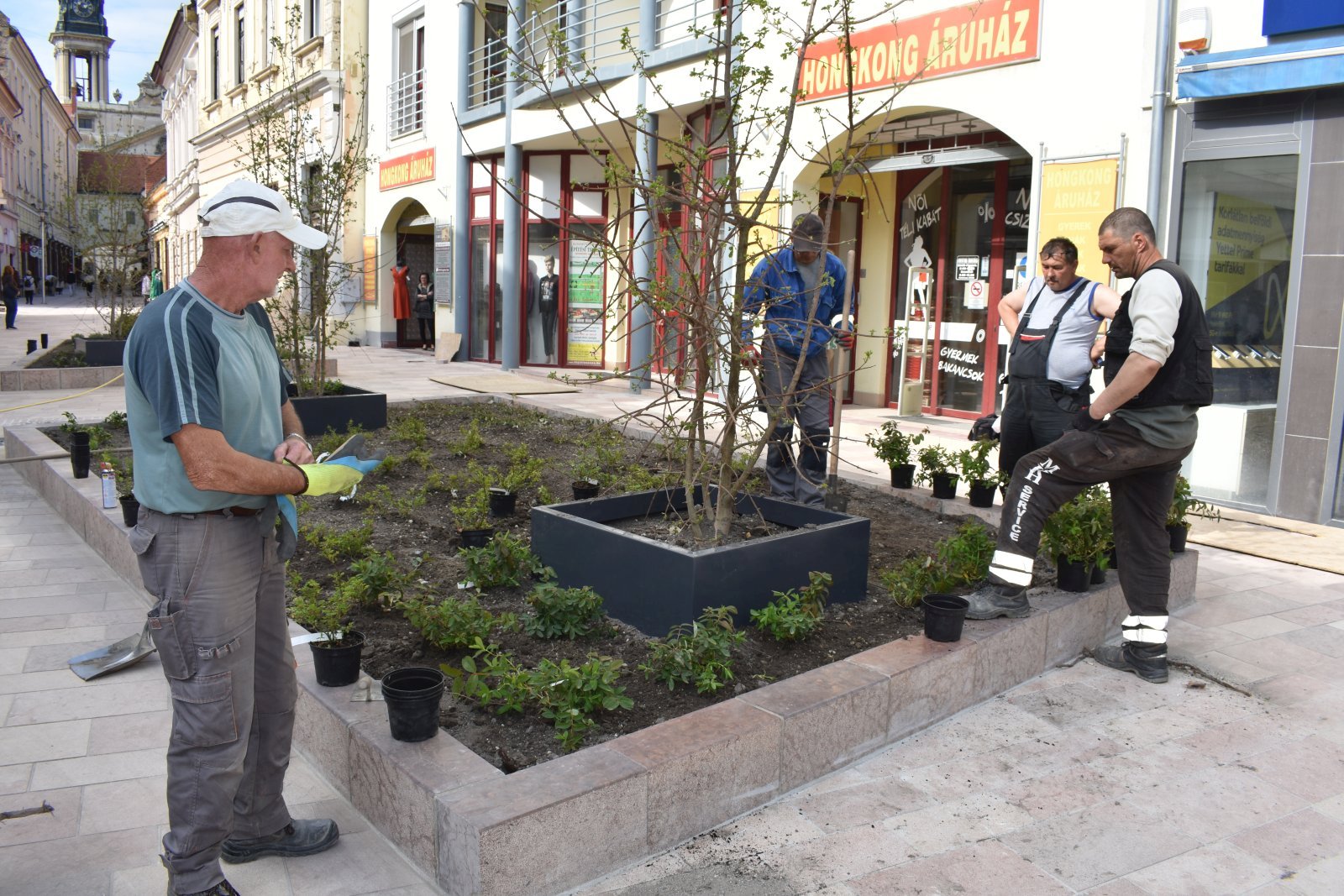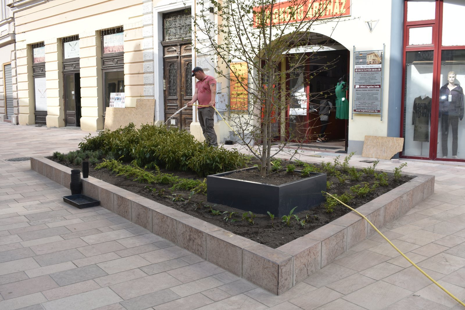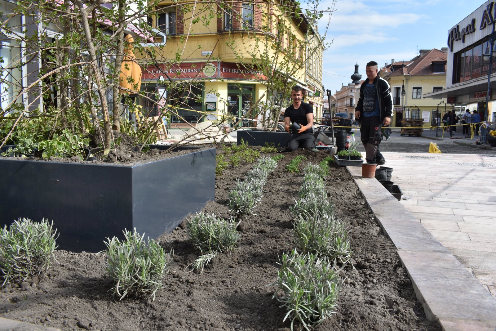 Ma reggel megkezdődött a növények telepítése a Kossuth utcán. A felújítás alatt álló szakasz Márton István utca felőli végében a terveknek megfelelően három növénykazettát alakítottak ki a kivitelezők, ezeket fényesre csiszolt felületű tardosi márványtömbök határolják, amelyek akár ülőpadként is funkcionálhatnak. A három virágsziget összesen 80 négyzetméter felületű, és közel 300 növény kap bennük helyet. A kerttervezők különösen változatos képet kívántak alkotni, így levendula, rózsa, vinca major, babér, cickafark, madárbirs, japáncserje és szamárkenyér került az ágyásokba. Minden növénykazettába fát is telepítettek, szép, előnevelt, többször átültetett juharok díszítik az utca ezen részét. A virágok gondozásához csepegtető rendszert építettek ki, így szárazság esetén is könnyen pótolható a szükséges vízmennyiség.