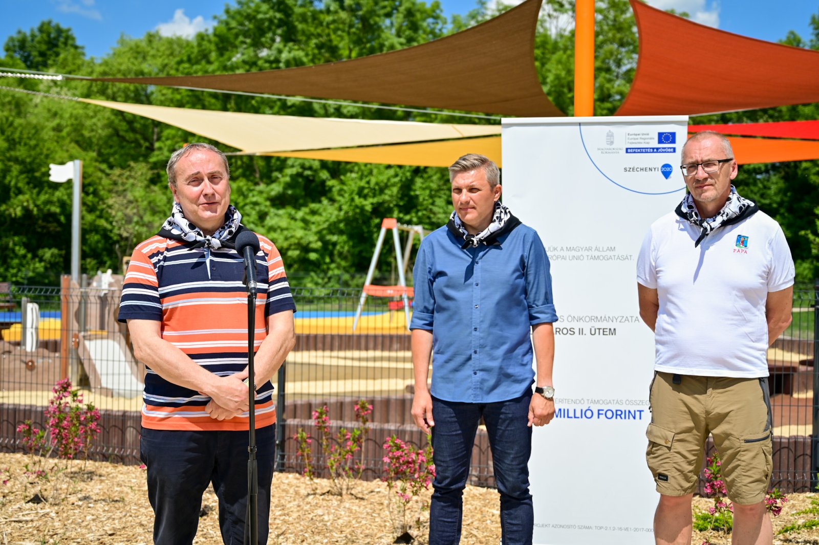 Sajtótájékoztatón összegezte a Zöld város II. projekt keretében elkészült játszótér és motorikus park műszaki tartalmát dr. Kovács Zoltán országgyűlési képviselő, dr. Áldozó Tamás polgármester és Rusznák Pál, a kivitelező cég tulajdonosa.