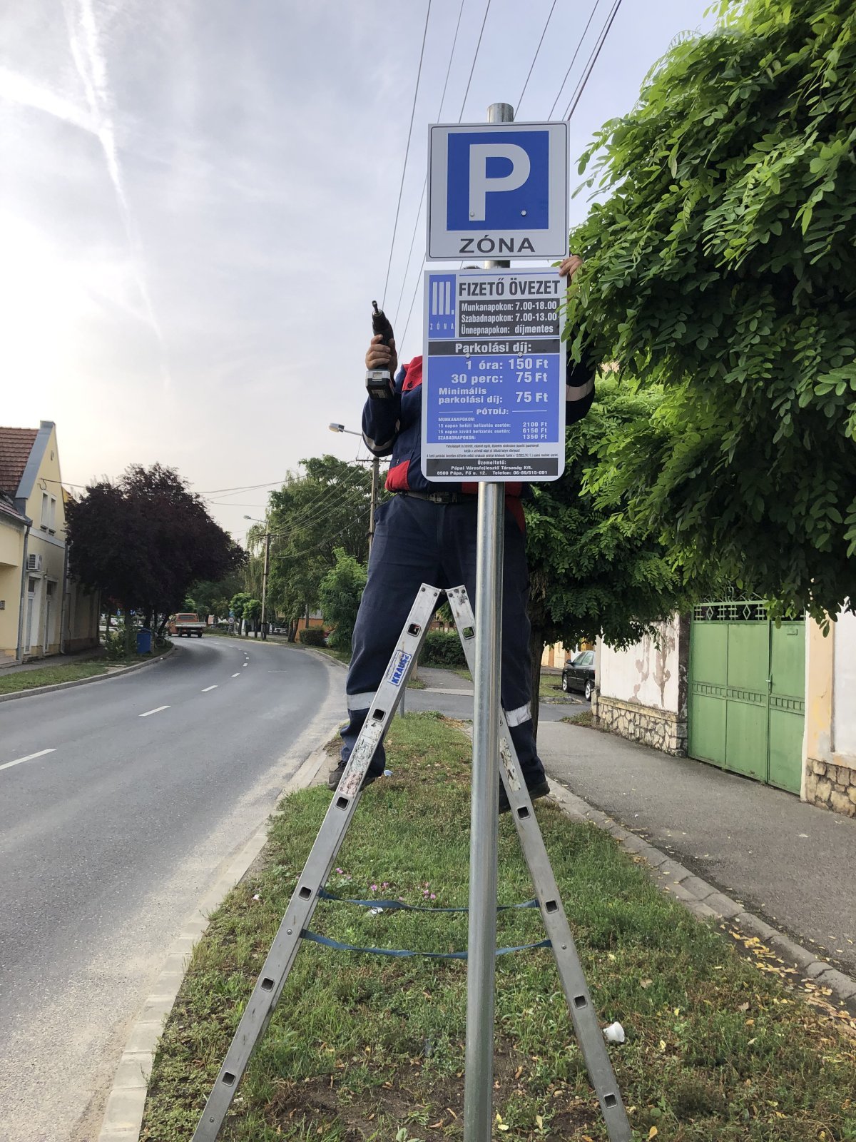 A Pápai Városfejlesztő Társaság Kft. munkatársai már megkezdték a közel kétszáz közlekedési tábla felszerelését a belvárosban, amelyek a fizetőparkolási zóna határait jelzik. Jelenleg nyolcvannál több táblát helyeztek ki, és hatvan figyelmeztető tábla is telepítésre került, de ezek fekete fóliával le vannak takarva, mivel az új rendelet szeptember 1-jén lép hatályba. A következő héten újabb táblák kerülnek ki, amelyek emlékeztetik a járművezetőket a fizetős övezetre. Bakos László, a Városfejlesztő Kft. közlekedési forgalomtechnikai szervezője elmondta, hogy hétfőtől új parkolóautomatákat telepítenek, amelyek működése szintén szeptember 1-jén kezdődik. Az önkormányzat új rendelete három övezetbe sorolja a belvárost, ahol a parkolási díjak 150 forinttól 400 forintig terjednek óránként.