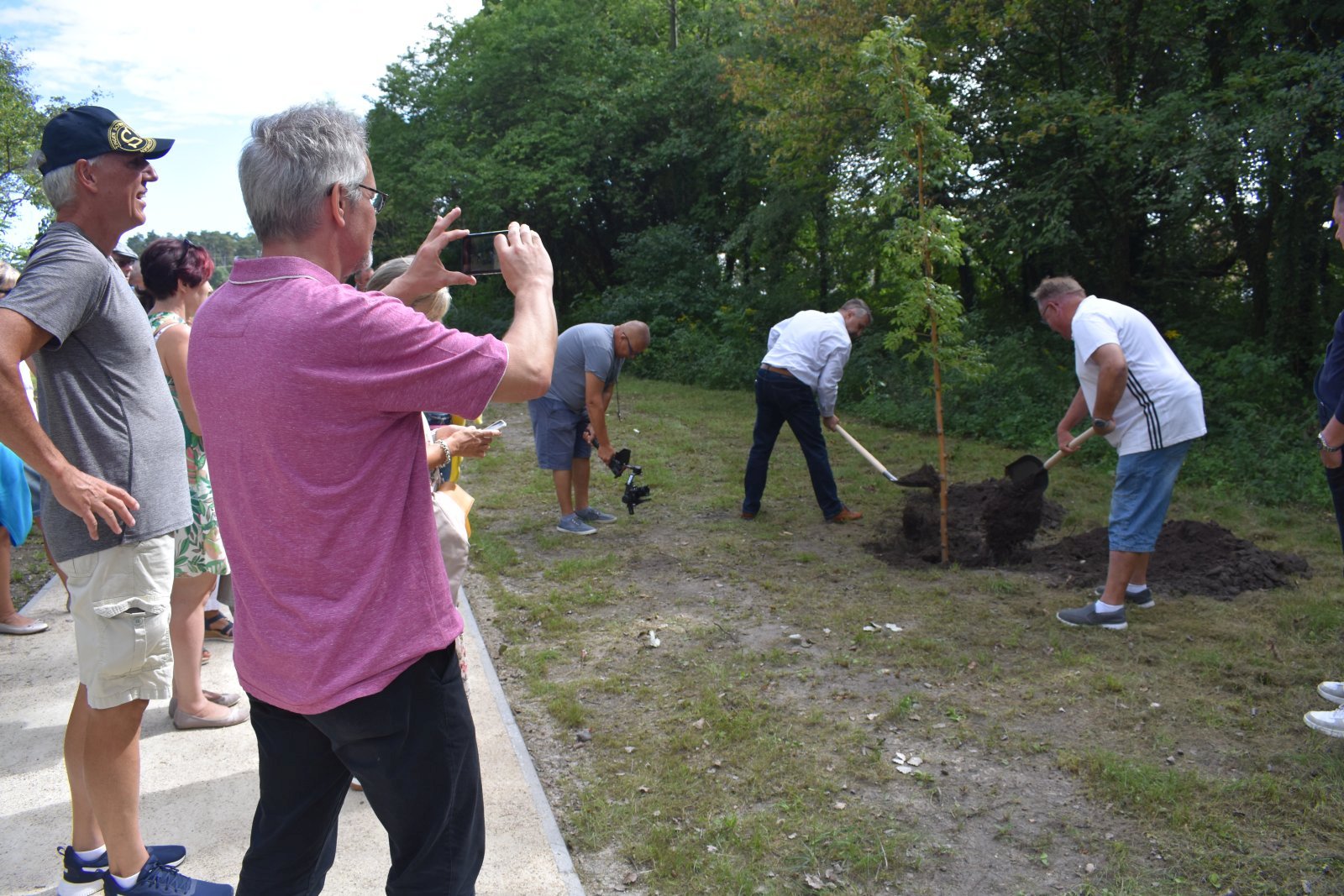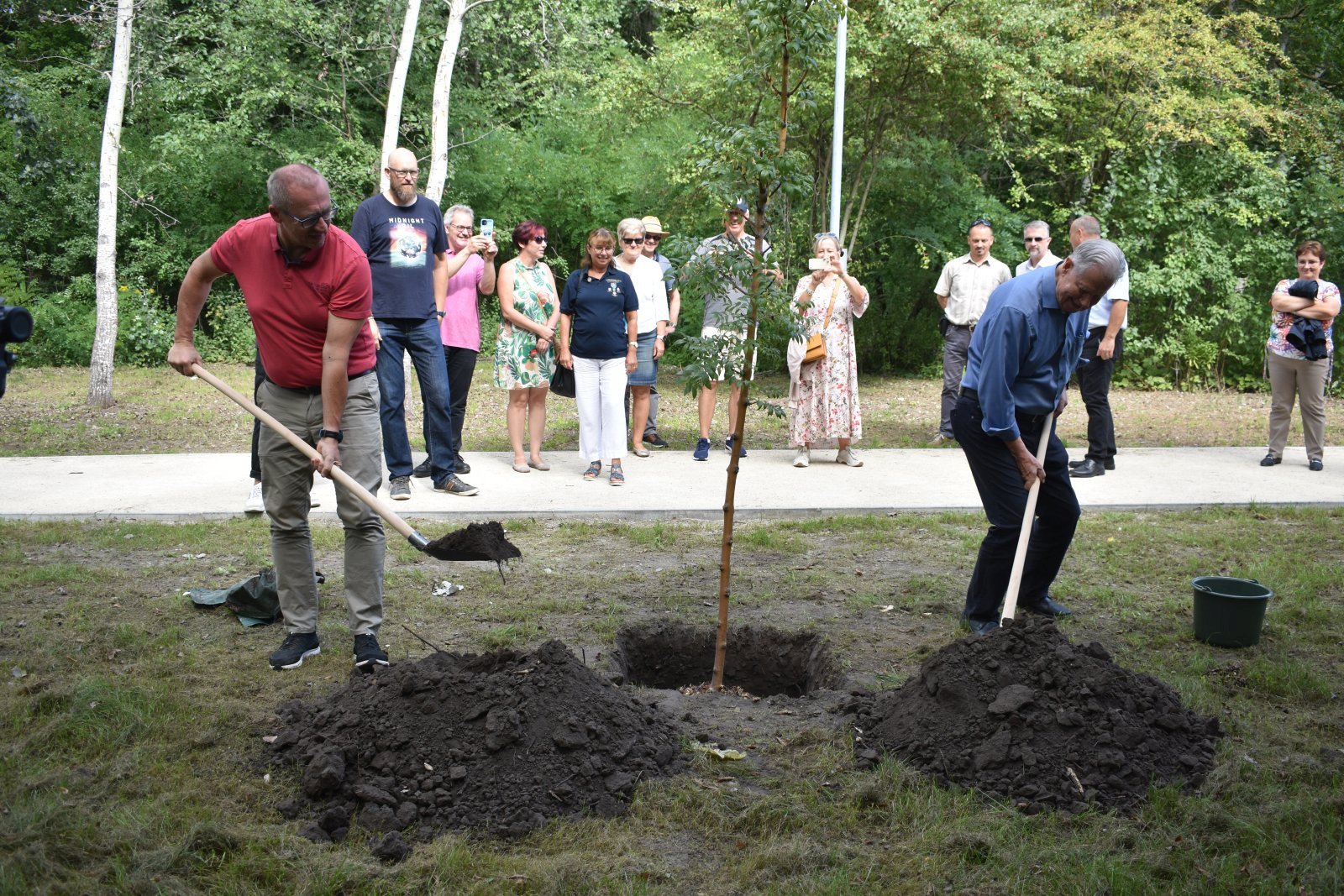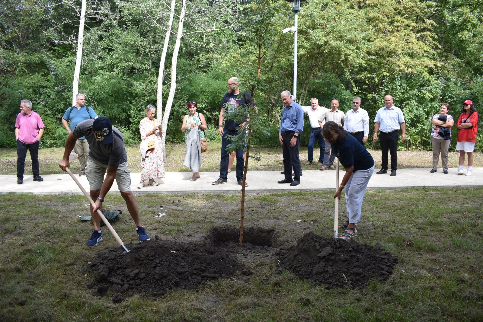 A város legújabb szabadidőparkjának a kisfenyvesbe nyúló sétánya mellett dr. Áldozó Tamás és Gerhardt Stratthaus polgármester egy kőrisfacsemetét ültetett az évforduló tiszteletére - ezzel is emlékezve a 30 évvel ezelőtti szerződés-aláírásra, hiszen a barátság jeleként akkor a németországi városban ültettek fát. A kis fa szomszédságában kapott helyet most az a díszes pad, melyet a 25 éves jubileum alkalmából, 2017-ben kapott városunk Schwetzingentől.