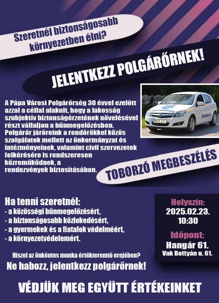 A Pápai Polgárőrség tagokat toboroz, amelyre február 23-án, vasárnap 10:30-kor kerül sor a Hangárban. Grőber Attila, a város vezetője hangsúlyozta, hogy a polgárőrség megújítása hozzájárulhat a lakosság biztonságérzetének növeléséhez. Marton Sándor önkormányzati képviselő elmondta, hogy a közbiztonság javítása érdekében igény mutatkozik a polgárőrökre, és a helyi vállalkozók is támogatnák a polgárőrség működését. Bauer Tibor rendőr alezredes kiemelte, hogy a rendőrség és a polgárőrség közötti együttműködés elengedhetetlen a közbiztonság fenntartásához. A városvezetés 14 éves kortól várja az önkénteseket, akik a kötelező közösségi szolgálatukat is teljesíthetik a polgárőrség keretein belül.