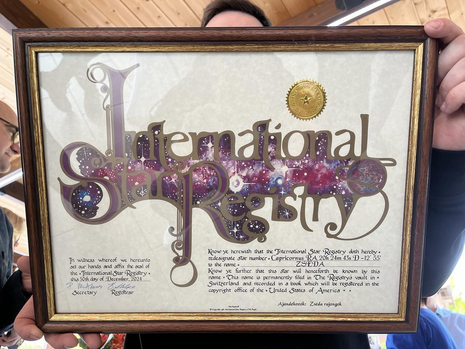 Trautman Ákos, a Zséda Rajongói Csoport tagja az igazoló oklevél átadásakor elmondta, hogy az énekesnő kerek születésnapja alkalmából szerették volna meglepni valami maradandó ajándékkal, így jutottak arra az elhatározásra, hogy egy csillagot fog tőlük kapni. A megfelelő regisztrációs folyamat eredményként 2024. december 30. óta (ez Zséda születésnapja) - ahogy fogalmazott – „Zséda néven egy csillag már ránk is ragyog”.