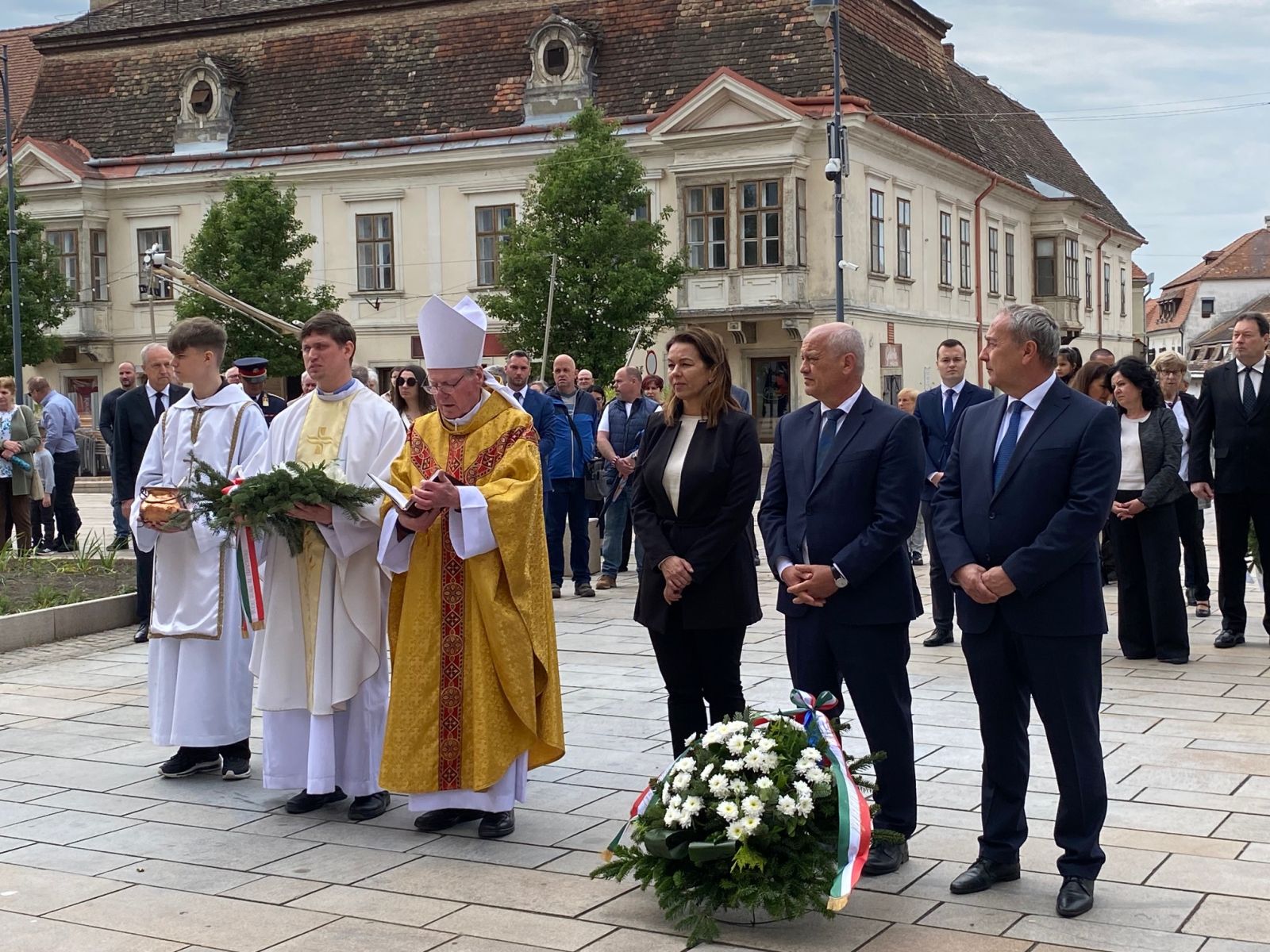A szentmisét követően a jelenlevők a Nagytemplom mellett álló Eszterházy Károly-szoborhoz vonultak át, ahol a templomi kórus szolgált, majd az imát követően dr. Kovács Zoltán országgyűlési képviselő, Grőber Attila polgármester és Vadász Krisztina alpolgármester, valamint Mail József apát-plébános és Meleg Máté atya koszorúztak, végezetül pedig a Pápai Nyugdíjasok Érekvédelmi-Érdekképviseleti Egyesülete képviseletében helyezték el a tisztelet virágait.