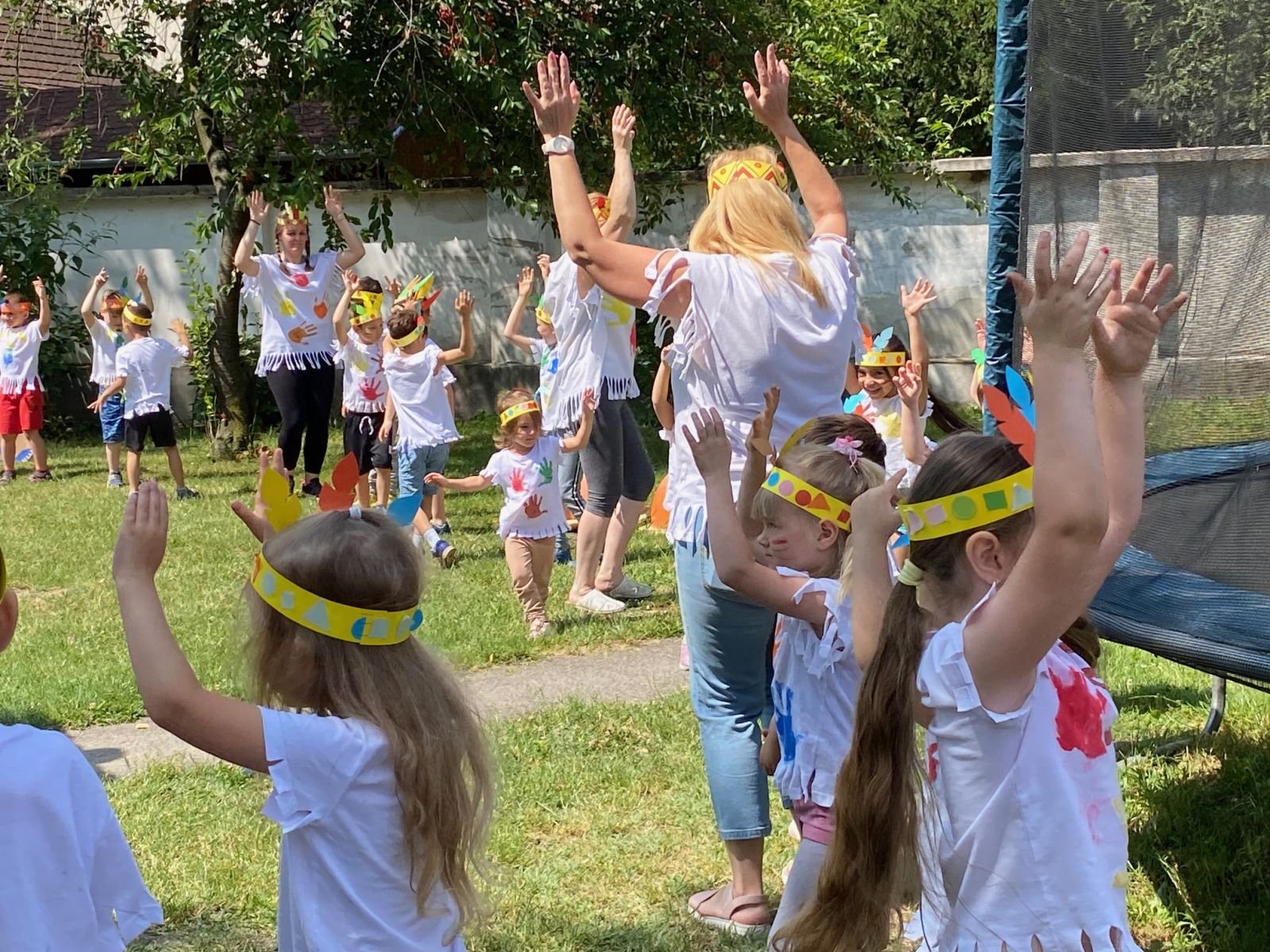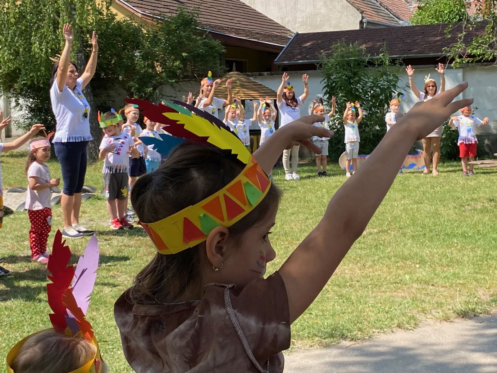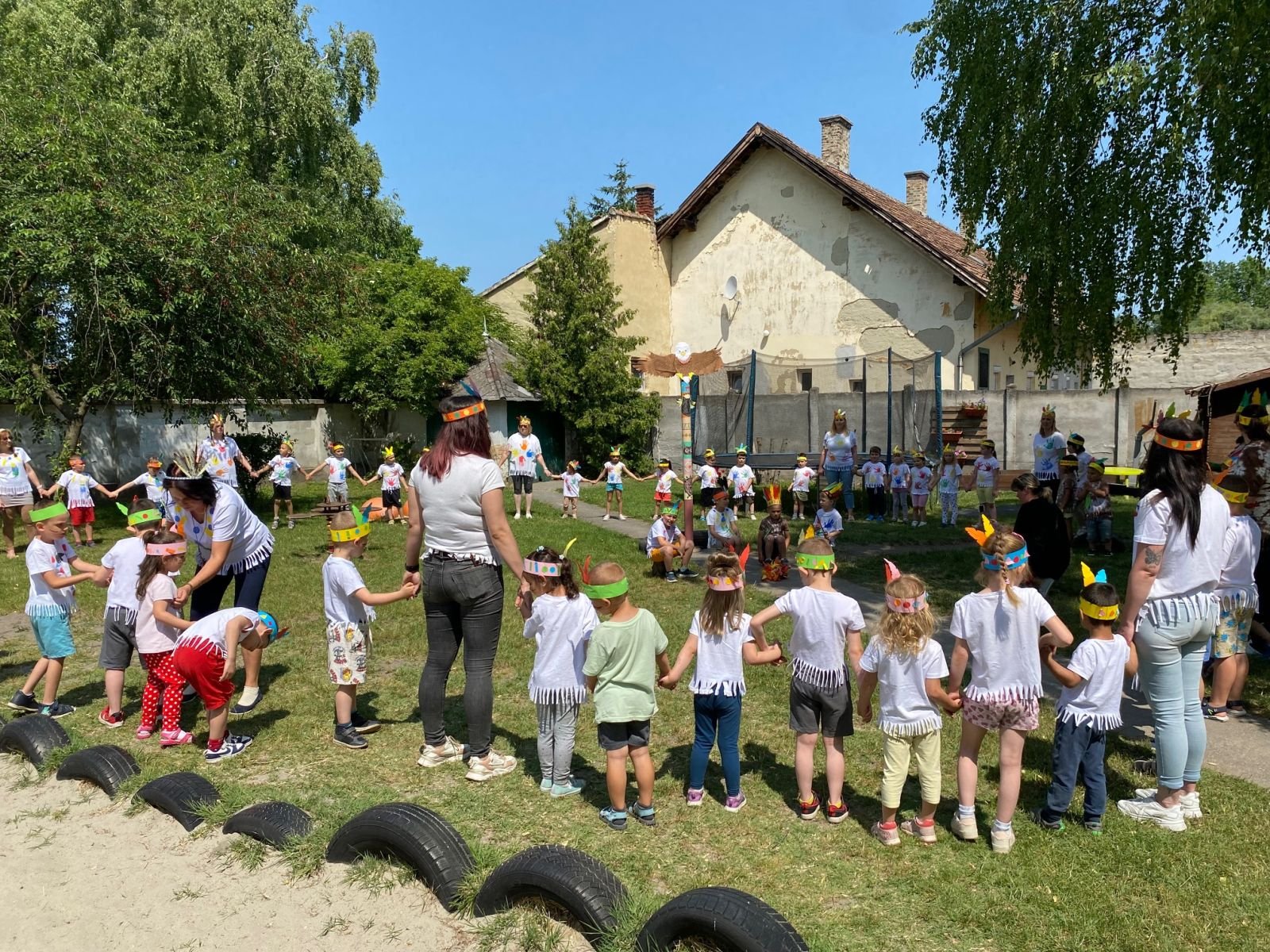 Minden sikeres próbáért egy-egy bátorságcsík került a gyermekek arcára, amit nagy büszkeséggel viseltek. A nap fénypontjaként a törzsfőnökök elszívták a békepipát, és a négy törzs egy nagy közösséggé egyesült. Az összetartozás szimbólumaként végül együtt járták el az esőtáncot az udvaron - persze nem a hétvégére fohászkodtak esőért, hiszen az ovisok is nagyon várják már a Játékfesztivált.