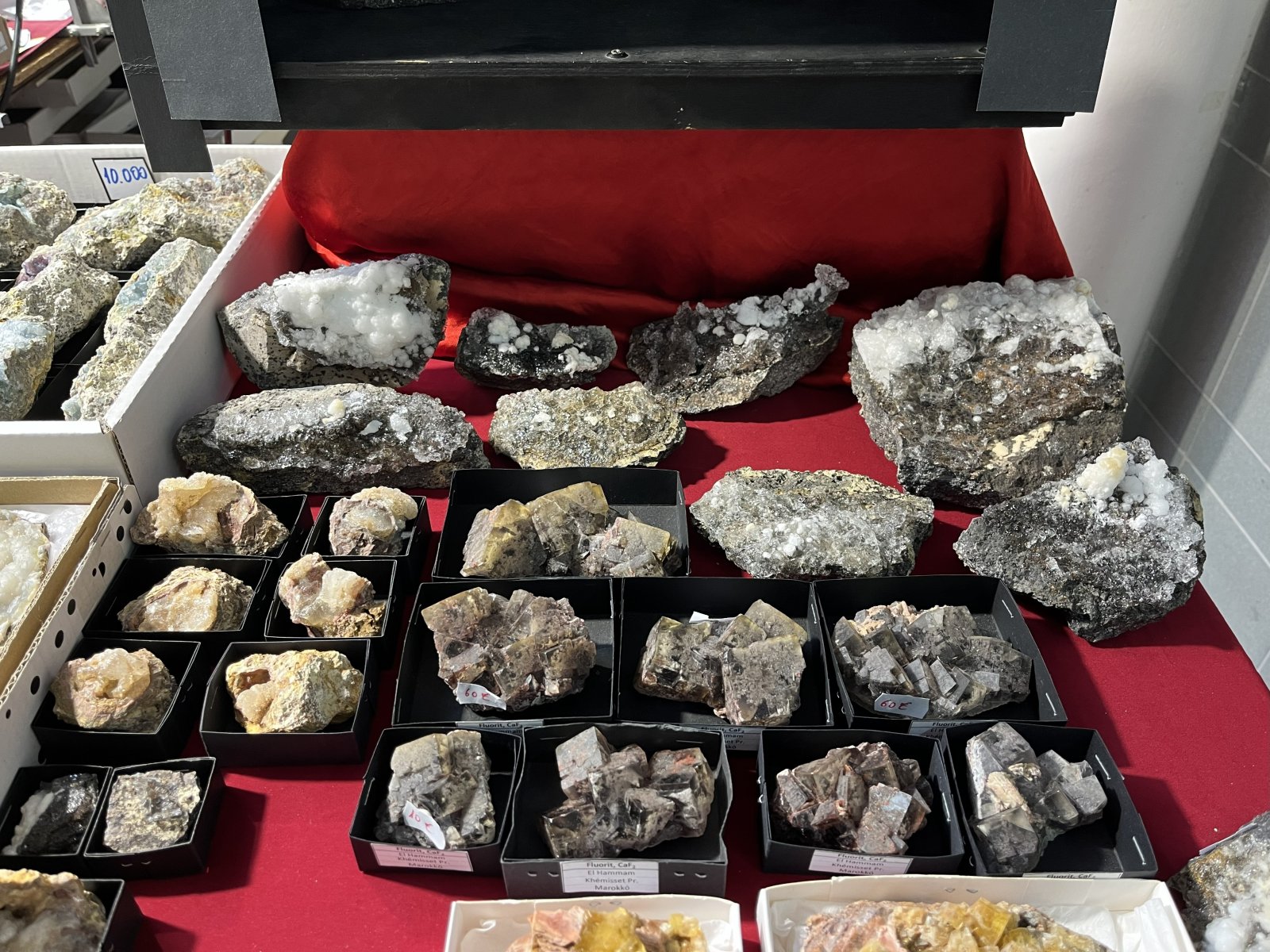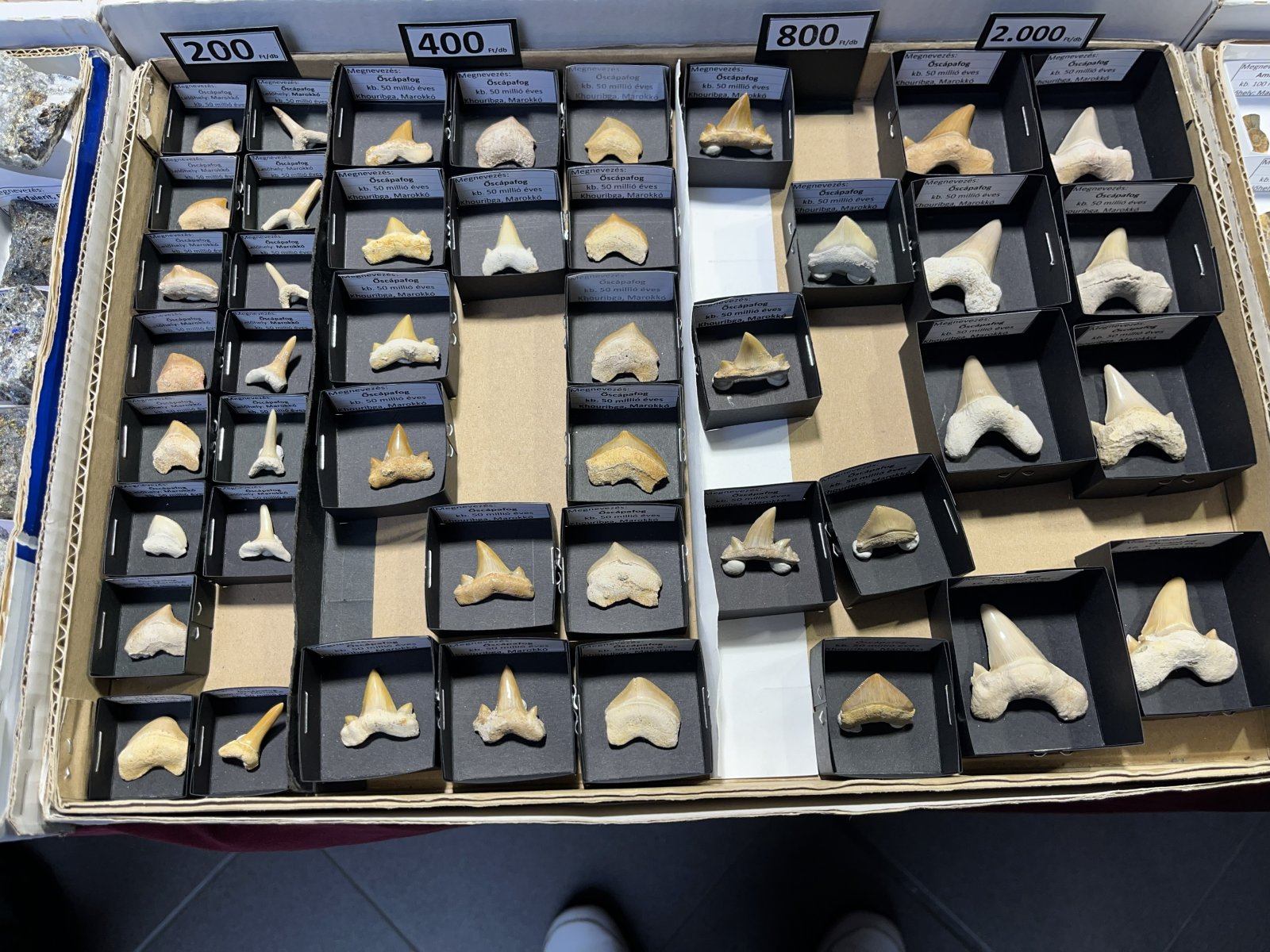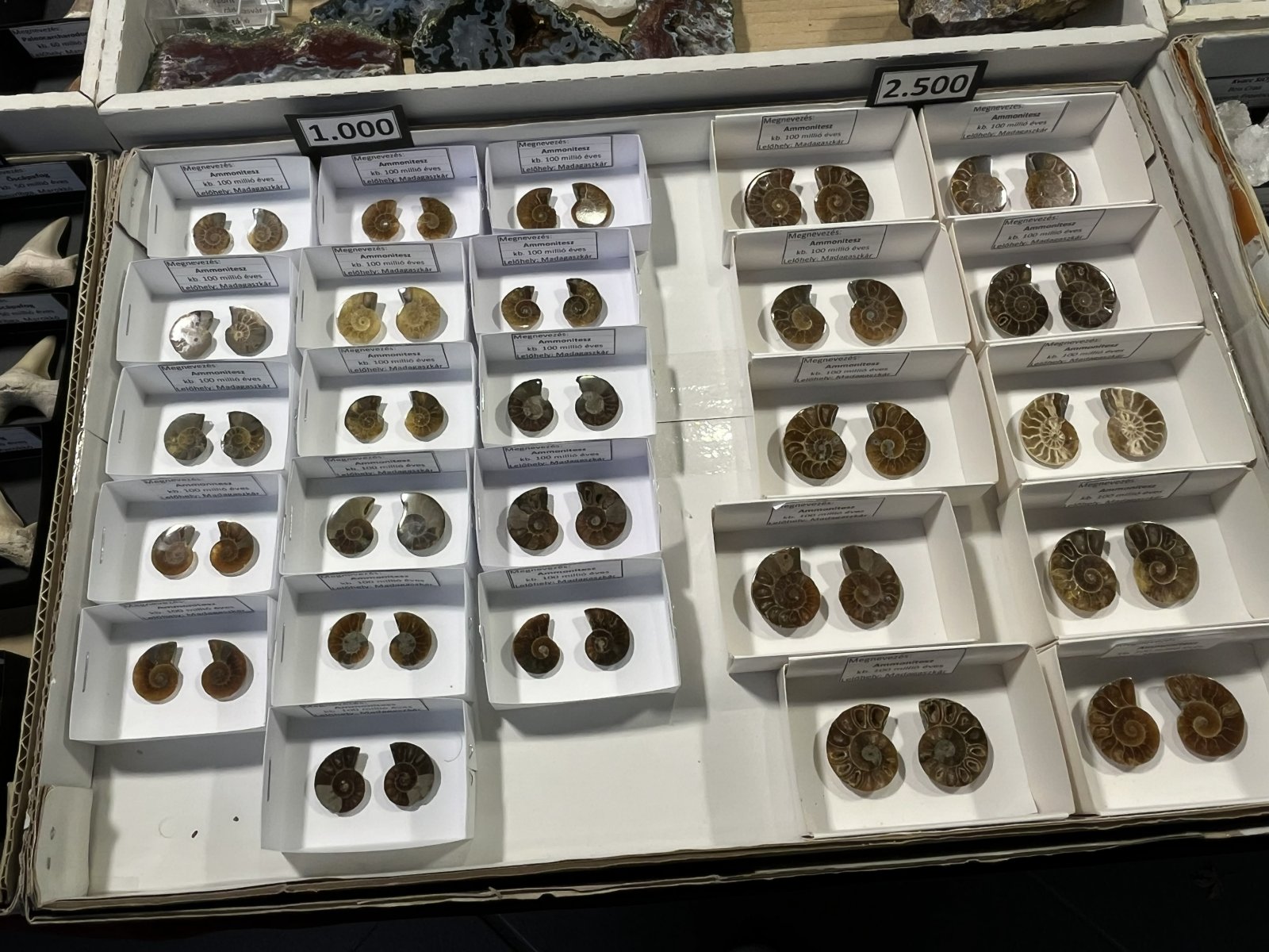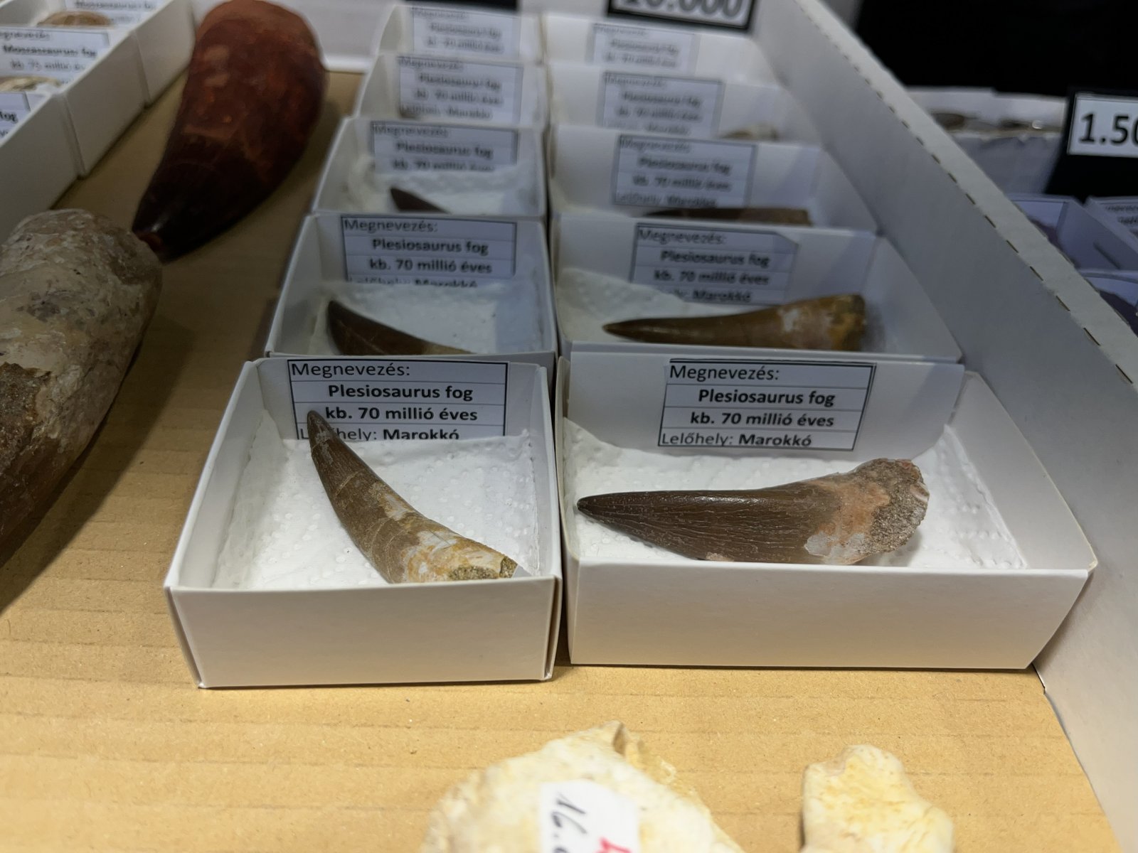 Sok asztalon voltak fosszíliák, vagy más néven ősmaradványok, ősleletek; az állatok, növények vagy más élő szervezetek megkövesedett, vagy egyéb módon megőrződött maradványai, illetve lenyomatai (ilyen lehet például a lábnyomuk), például cápafogak, vagy ammoniteszek jellegzetes maradványai. Nagyon sokan megnézték az Ichthyosaurus Breviceps fosszíliájának látványos gipszmásolatát is (az eredeti ősmaradvány értéke százezer dollárban mérhető...). A gyerekeket különféle játékokkal is várták a szervezők, és sok kiállítónál zsákbamacskát is vásárolhattak maguknak. Ki tudja, lehet, hogy egy ilyen csomagban talált néhány meglepetés ásvány indít el valakit a gyűjtővé válás felé?
