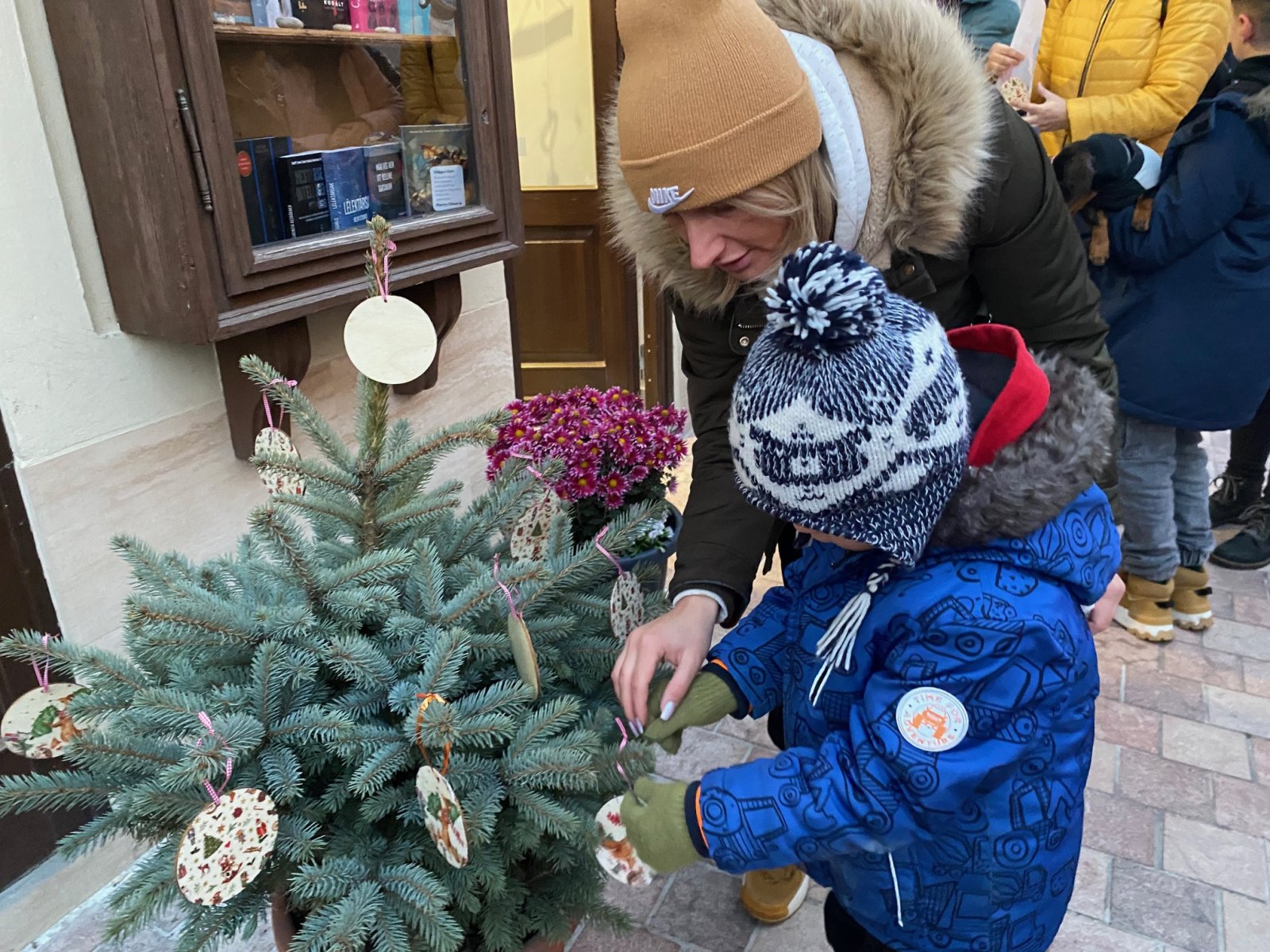 Karácsonyi hangulat lengte be a belvárost, amikor a Pápai Városi Óvodák gyermekei térképpel a kezükben járták végig az üzleteket, hogy elhelyezzék saját készítésű díszeiket a kis cserepes fenyőfákon. A gyerekek családtagjaikkal és óvónőikkel együtt érkeztek, és egy játékos kincskereső útvonal mentén keresték fel azokat az üzleteket, amelyek fenyőfáit ők díszíthették fel.