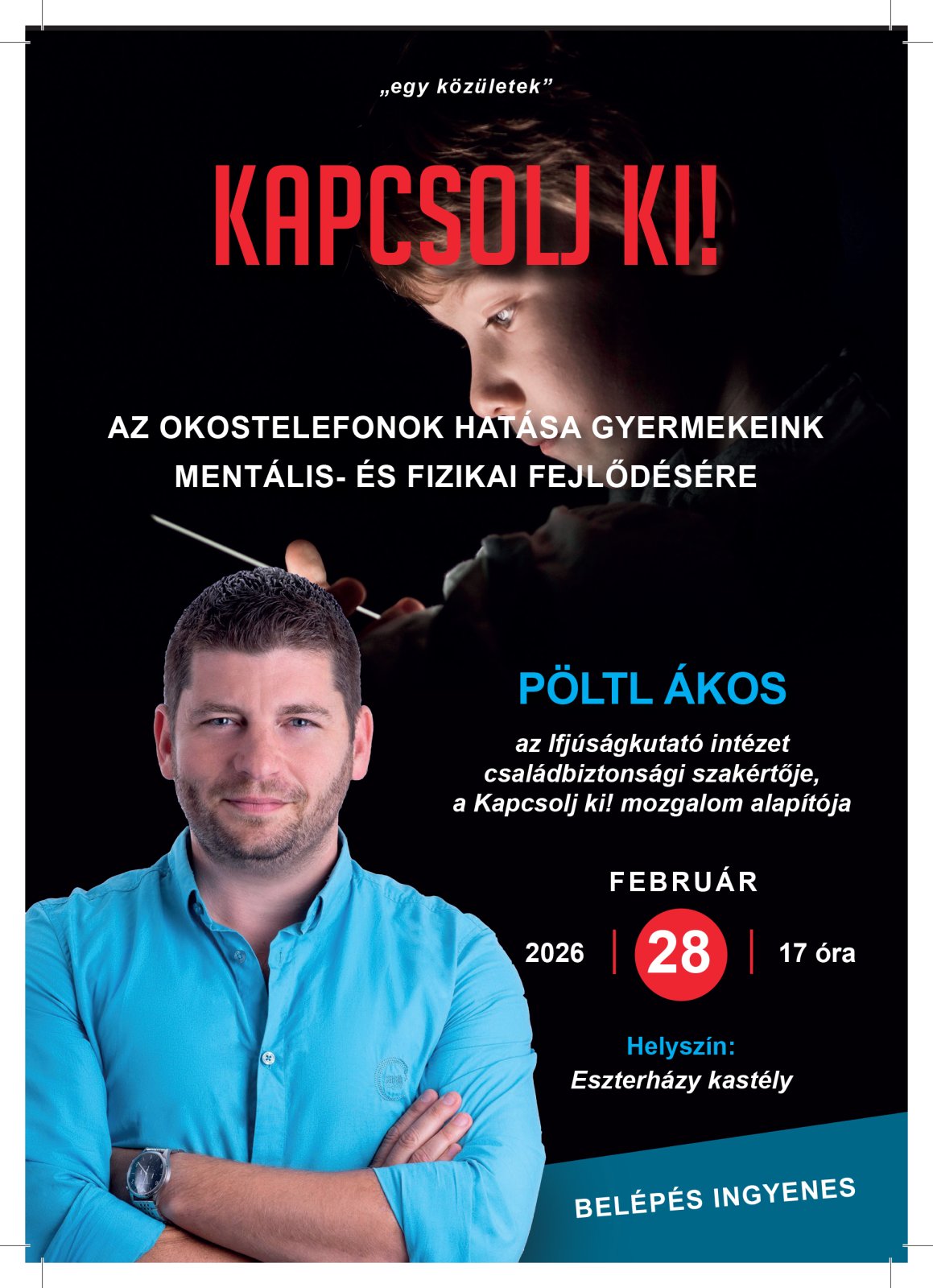 Szombaton délután az Esterházy-kastélyban érdekes előadásra várják az érdeklődőket, amelyet Nardai Péter, az "Egy közületek" előadássorozat életrehívója szervezett. Az előadónak Pöltl Ákost, az Ifjúságkutató Intézet családbiztonsági szakértőjét kérte fel, aki a mobiltelefonok mentális és fizikai hatásait vizsgálja, különösen a gyermekek fejlődésére gyakorolt hatásukat. Nardai Péter hangsúlyozta, hogy a mobiltelefon használata súlyos függőséget okozhat, amely hasonlóan veszélyes lehet, mint az alkohol- vagy kábítószerfüggőség. Az előadás célja, hogy bemutassa a telefonos működés hátterét és a gyermekekre gyakorolt hatását, mivel a digitális tartalmak folyamatosan lekötik őket. Az esemény február 28-án 17 órakor kezdődik, és a belépés ingyenes.