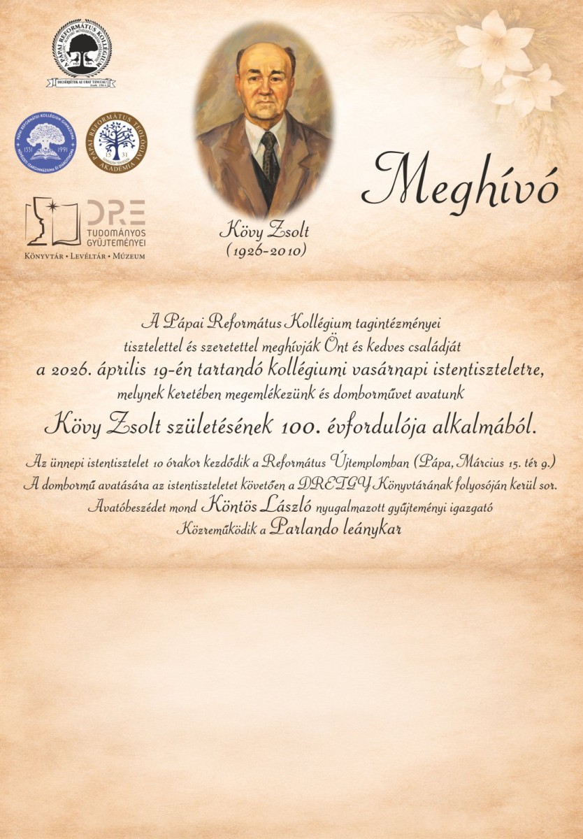 Vasárnap ünnepi istentisztelet és emlékavatás keretében tisztelegnek Kövy Zsolt előtt születésének 100. évfordulója alkalmából. A szervezők szerint az esemény jelentősége túlmutat egy hagyományos évfordulón. Kövy Zsolt személye kulcsszerepet játszott abban, hogy a Pápai Református Kollégium intézményrendszere újra megerősödhessen. Református lelkészként, gyűjteményi igazgatóként, főigazgatóként is meghatározó munkát végzett, és jelentősen hozzájárult ahhoz, hogy a kollégium különálló egységei - a gimnázium, a teológia és a gyűjtemények - egységes közösséget alkossanak.