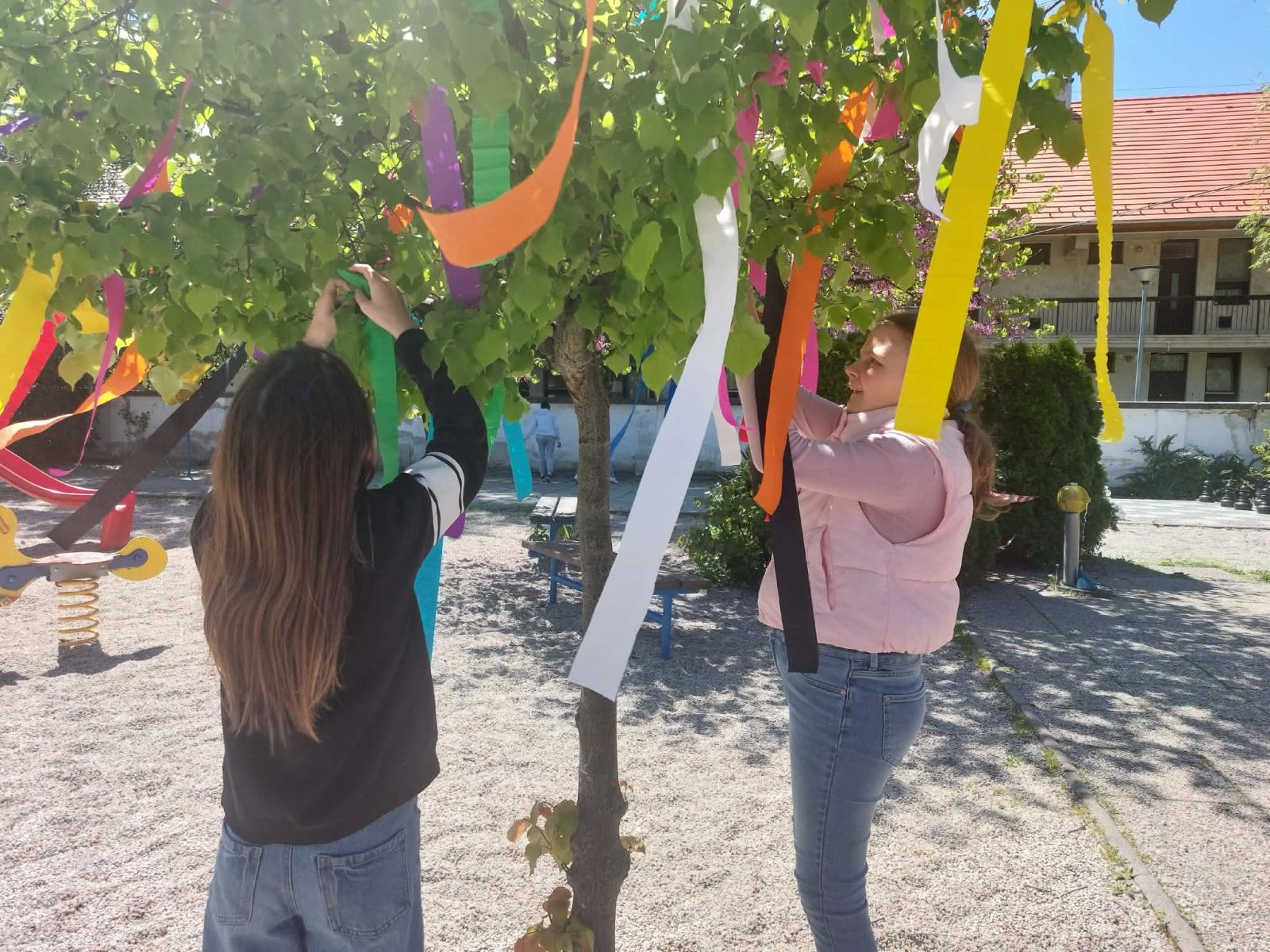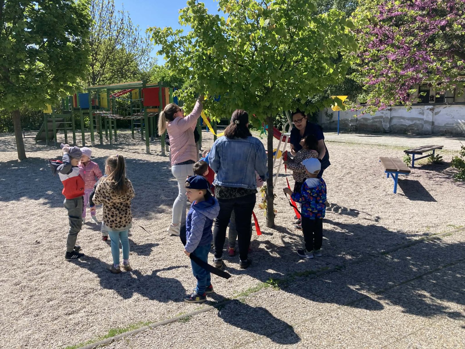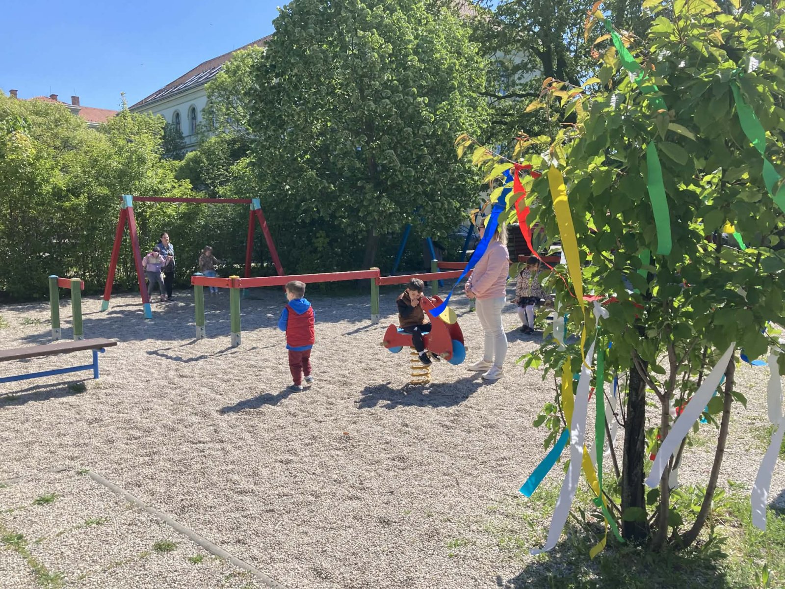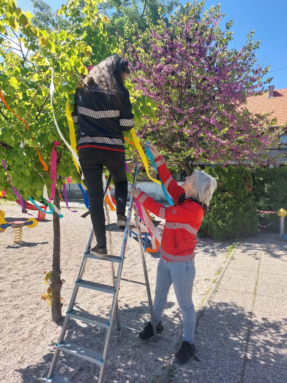 Az udvar két fája is májusfává változott, a gyerekek színes szalagokkal díszítették fel az ágakat, így köszöntve a tavaszt és a megújulást. A délelőtt folyamán a Pápai Városi Óvodák Székhely Óvodájának Süni és Csigabiga csoportja látogatott el a játszótérre, ahol nemcsak segítettek a díszítésben, hanem tavaszi dalokkal is hozzájárultak remek hangulathoz.