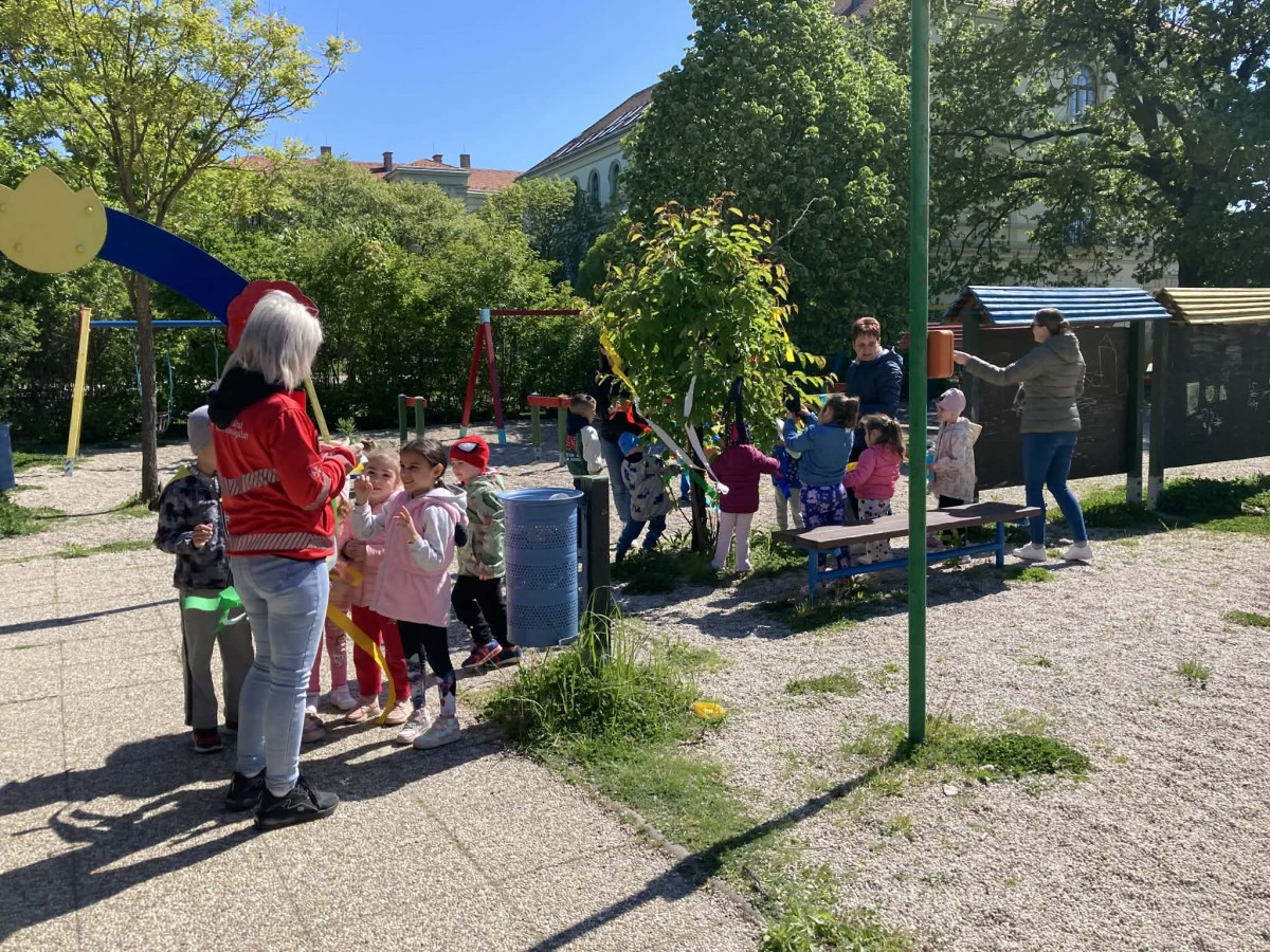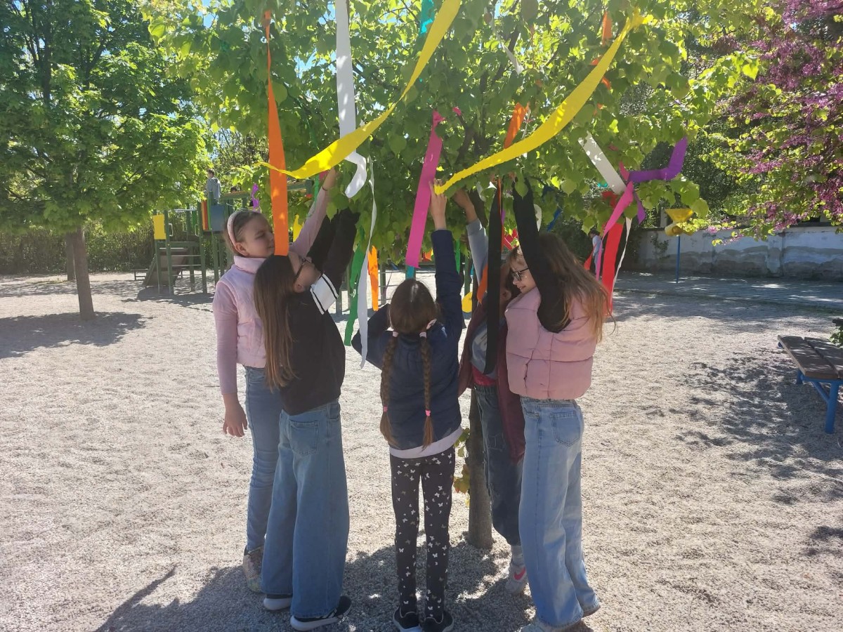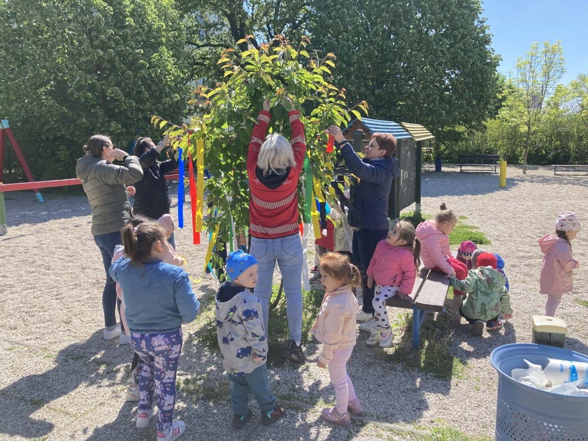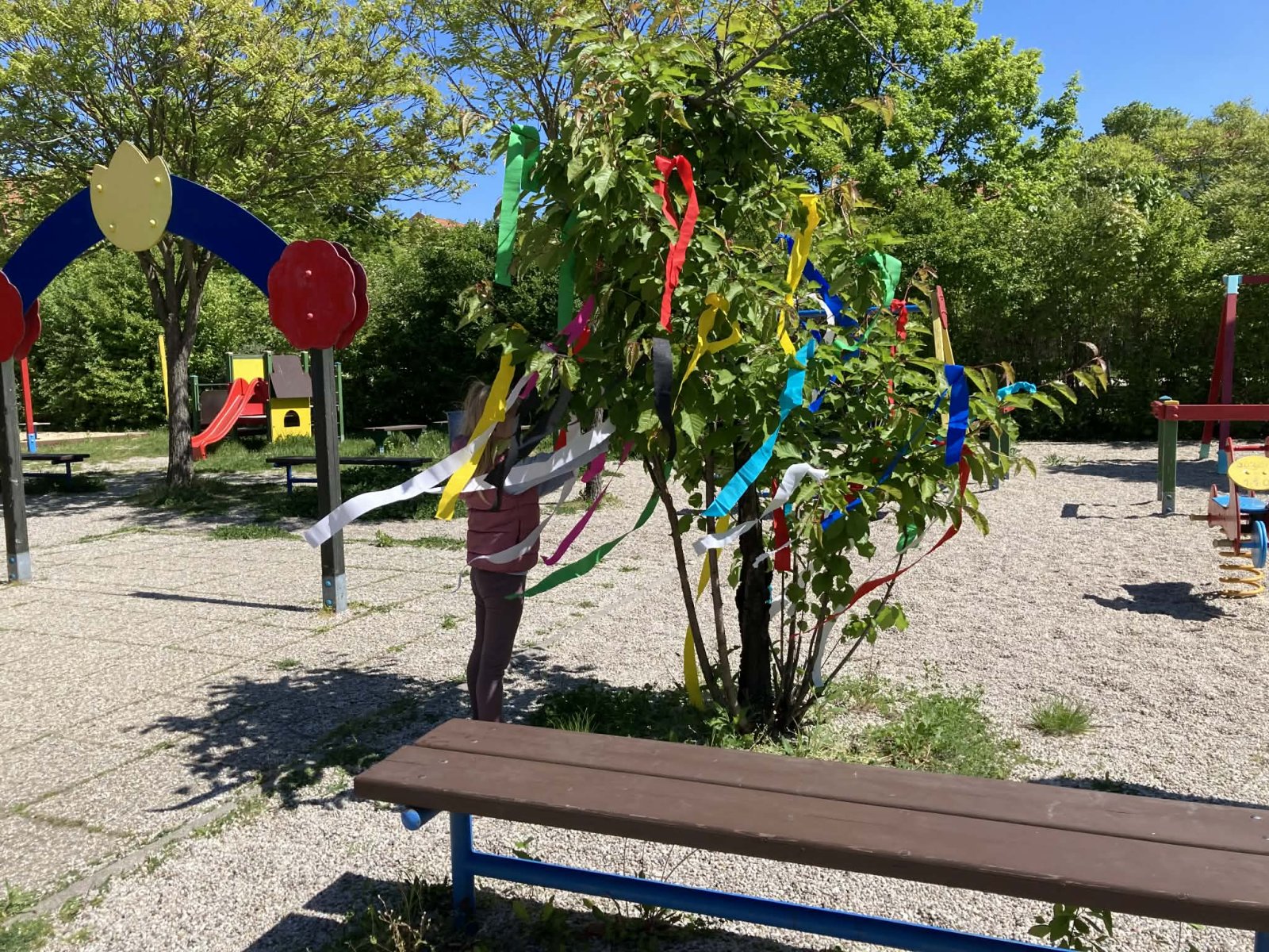 Az udvar két fája is májusfává változott, a gyerekek színes szalagokkal díszítették fel az ágakat, így köszöntve a tavaszt és a megújulást. A délelőtt folyamán a Pápai Városi Óvodák Székhely Óvodájának Süni és Csigabiga csoportja látogatott el a játszótérre, ahol nemcsak segítettek a díszítésben, hanem tavaszi dalokkal is hozzájárultak remek hangulathoz.