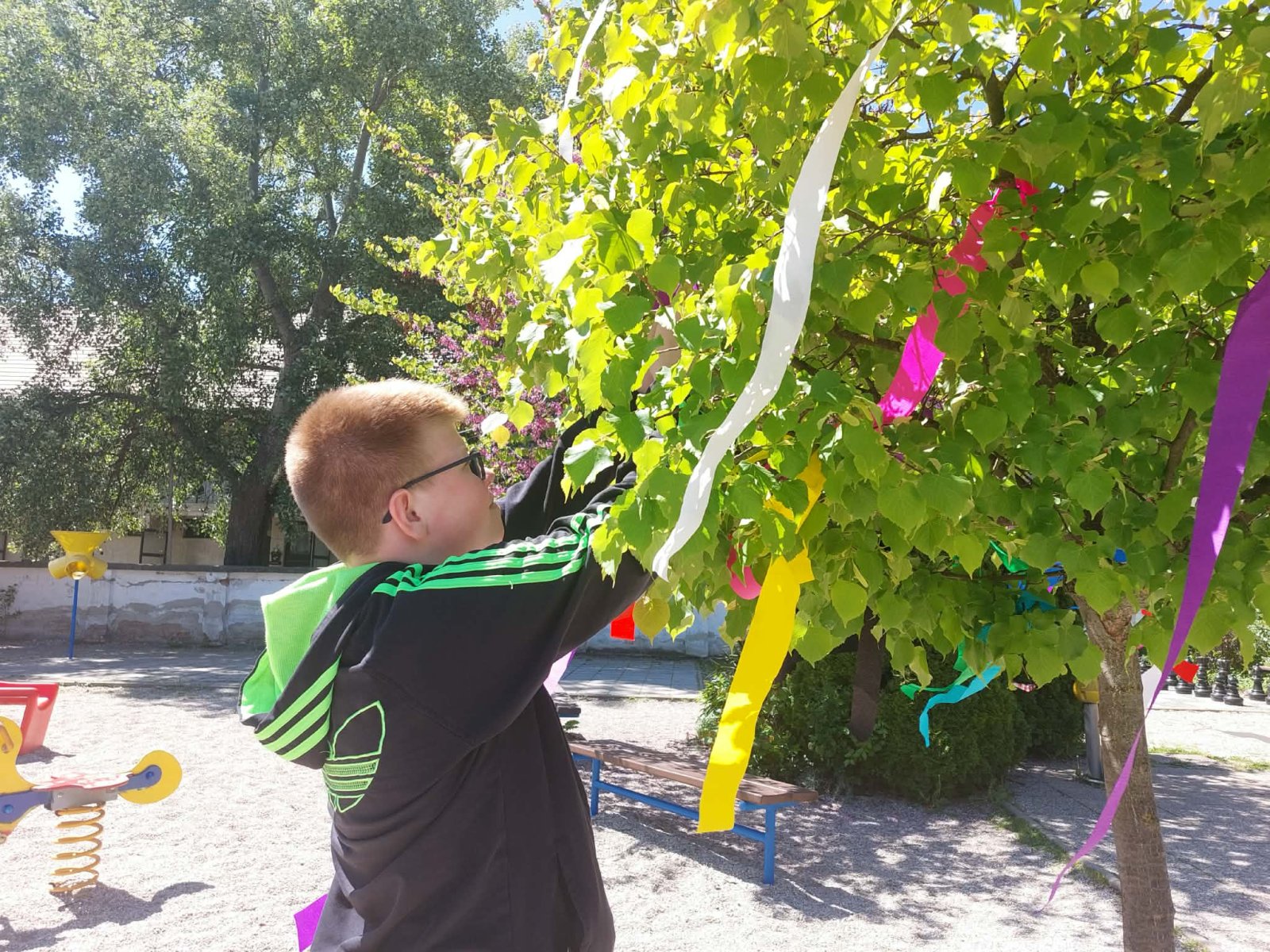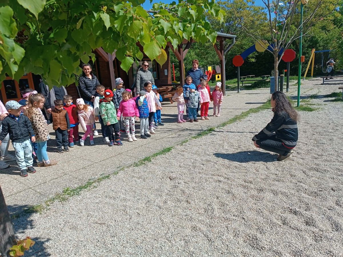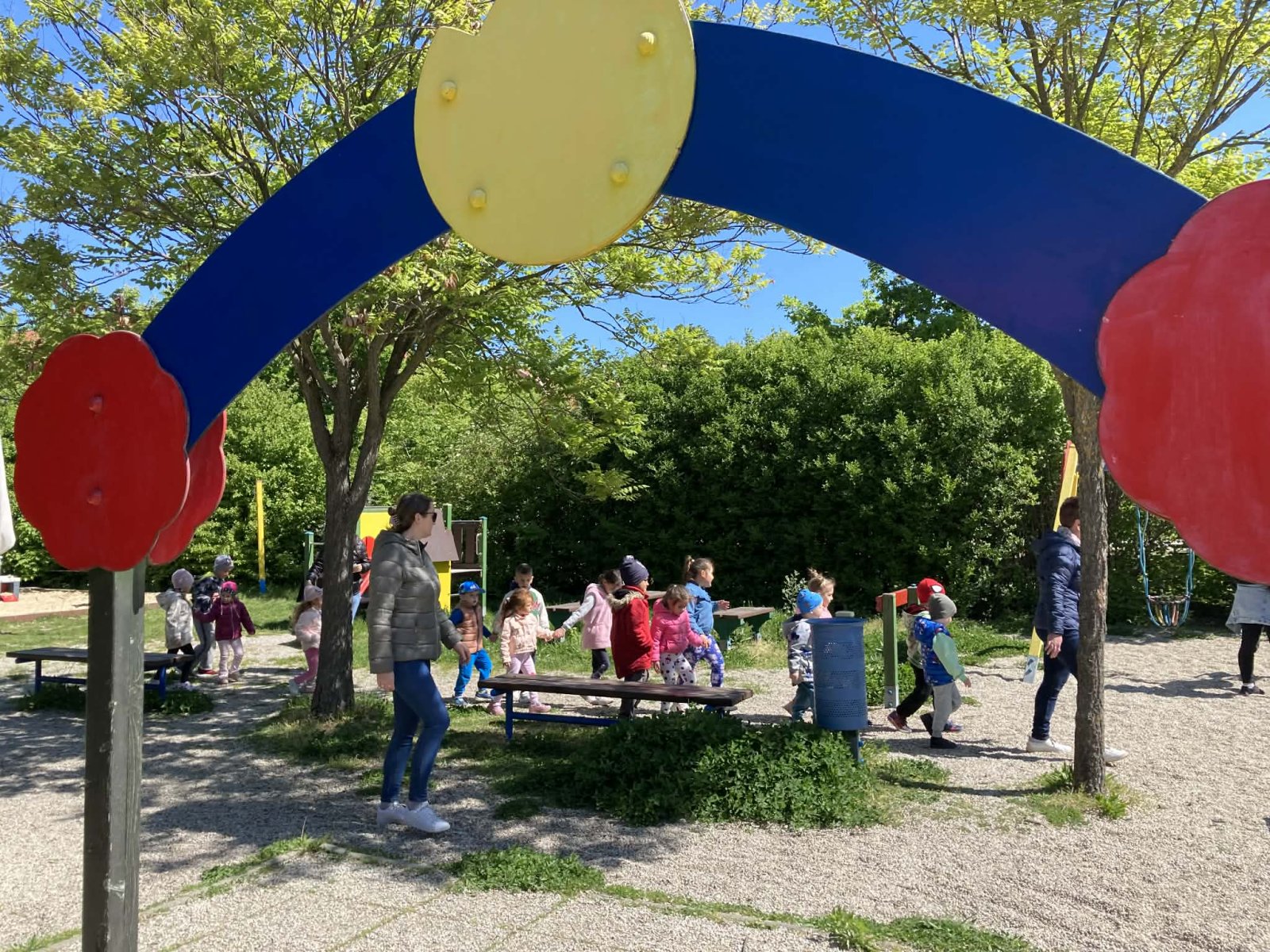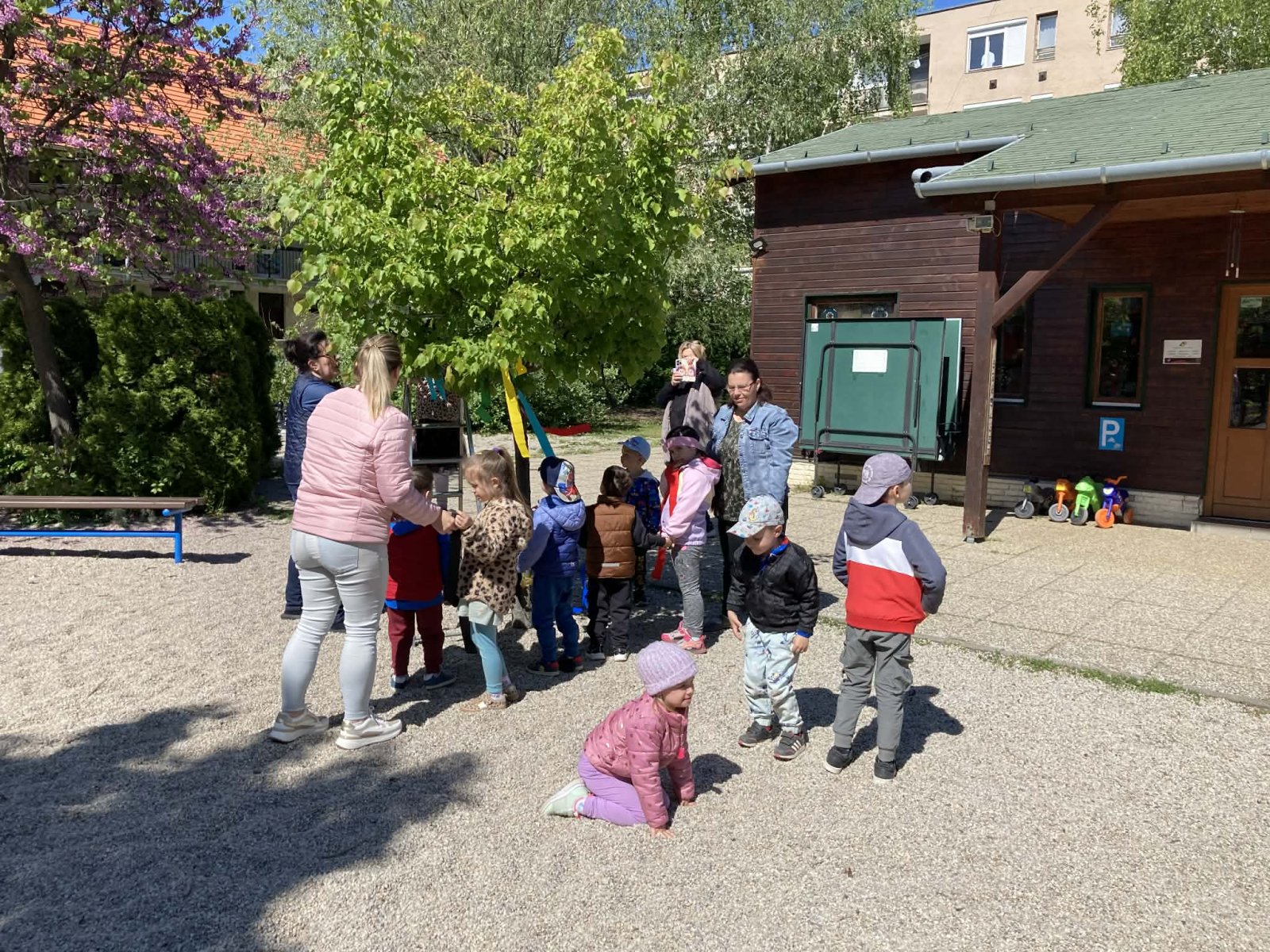 Az udvar két fája is májusfává változott, a gyerekek színes szalagokkal díszítették fel az ágakat, így köszöntve a tavaszt és a megújulást. A délelőtt folyamán a Pápai Városi Óvodák Székhely Óvodájának Süni és Csigabiga csoportja látogatott el a játszótérre, ahol nemcsak segítettek a díszítésben, hanem tavaszi dalokkal is hozzájárultak remek hangulathoz.