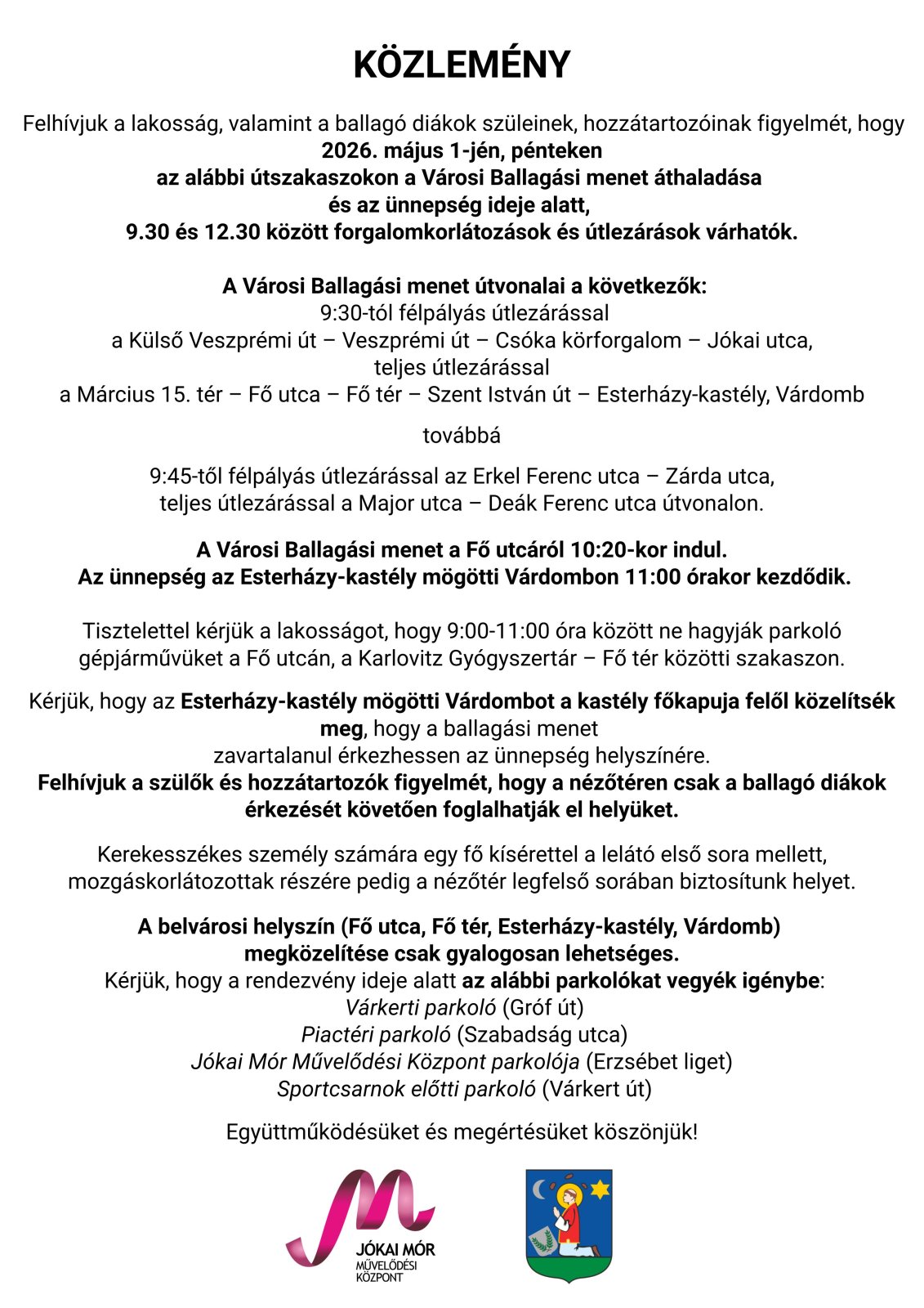 A Városi Ballagási menet a Fő utcáról 10:20-kor indul. Az ünnepség az Esterházy-kastély mögötti várdombon 11:00 órakor kezdődik.