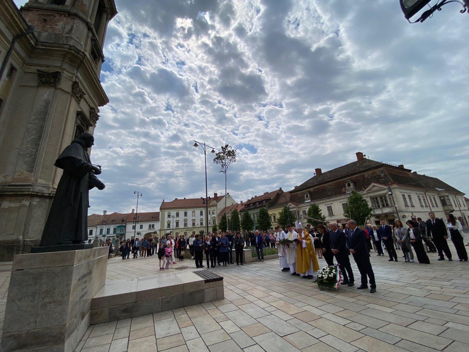 A szentmisét követően a jelenlevők a Nagytemplom mellett álló Eszterházy Károly-szoborhoz vonultak át, ahol a templomi kórus szolgált, majd az imát követően dr. Kovács Zoltán országgyűlési képviselő, Grőber Attila polgármester és Vadász Krisztina alpolgármester, valamint Mail József apát-plébános és Meleg Máté atya koszorúztak, végezetül pedig a Pápai Nyugdíjasok Érekvédelmi-Érdekképviseleti Egyesülete képviseletében helyezték el a tisztelet virágait.