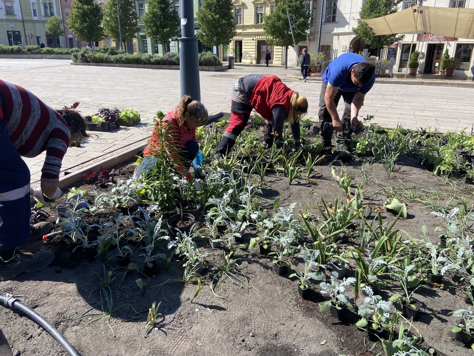 A város tavaszi-nyári virágosítása idén is látványos formákat ölt. A Március 15. téren már hétfőn javában dolgoztak a kertészek: a virágágyásokba mintegy 1400 tő növény került, köztük begóniák, batáták, hamvaskák, kannavirágok és büdöskék. A főkertész szerint ez az ágyás különösen nagy kihívást jelent, hiszen kokárda alakzatban, piros-fehér-zöld színekben kell elültetni a növényeket, miközben a derékszögek pontos betartása is elengedhetetlen.