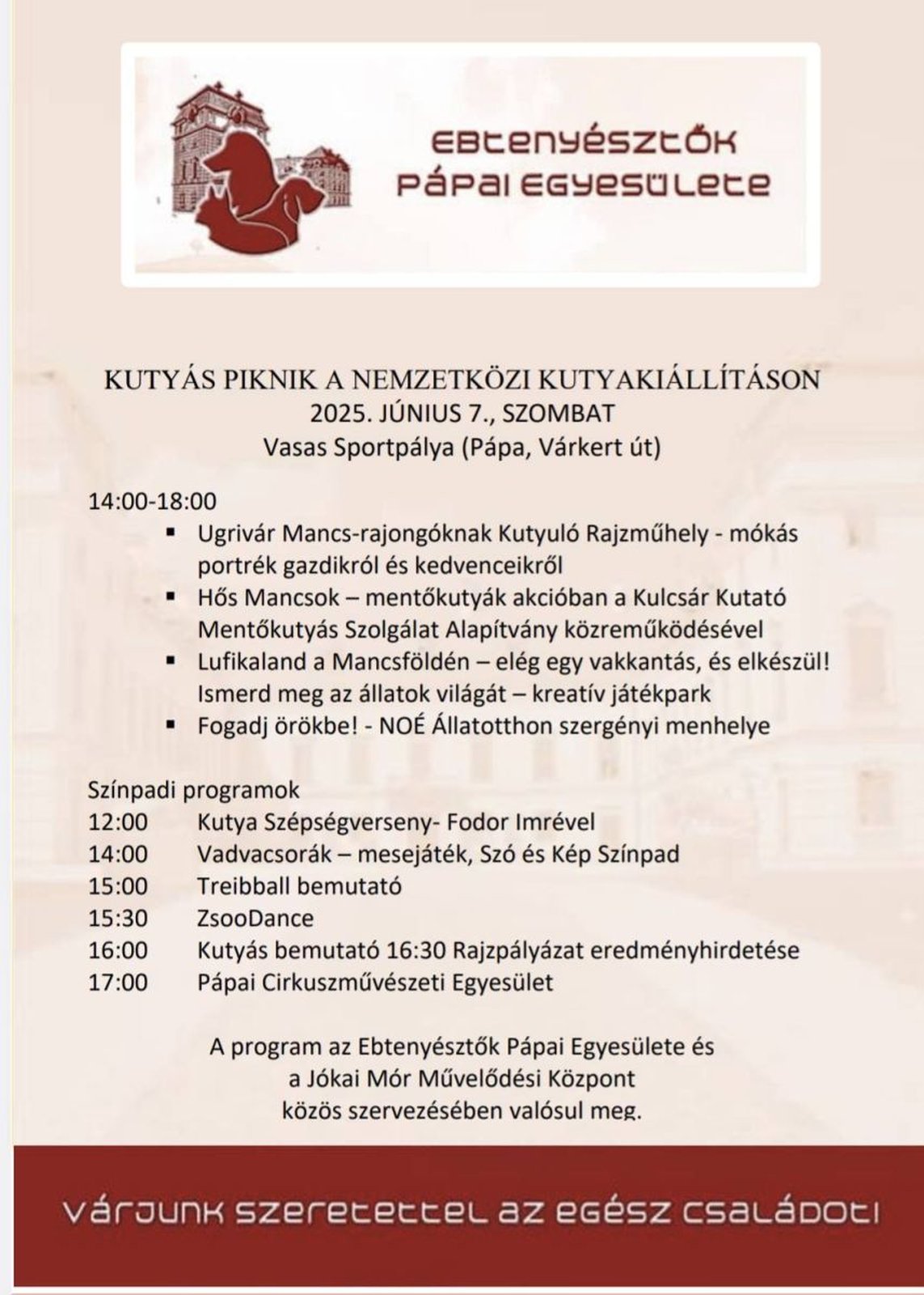 Szombaton debütál egy új program is: az első Pápai Kutyás Piknik, melyet a várossal közösen szervez az egyesület. A pikniken színes kísérőprogramok várják az érdeklődőket – lesz táncbemutató, ugrálóvár, családi játékok és természetesen sok kutyás program is. A hobbi kutyáknak szervezett szépségverseny a mérsékelt érdeklődés miatt sajnos elmarad, közölte Lovas Ferenc az Ebtenyésztők Pápai Egyesületének titkára.