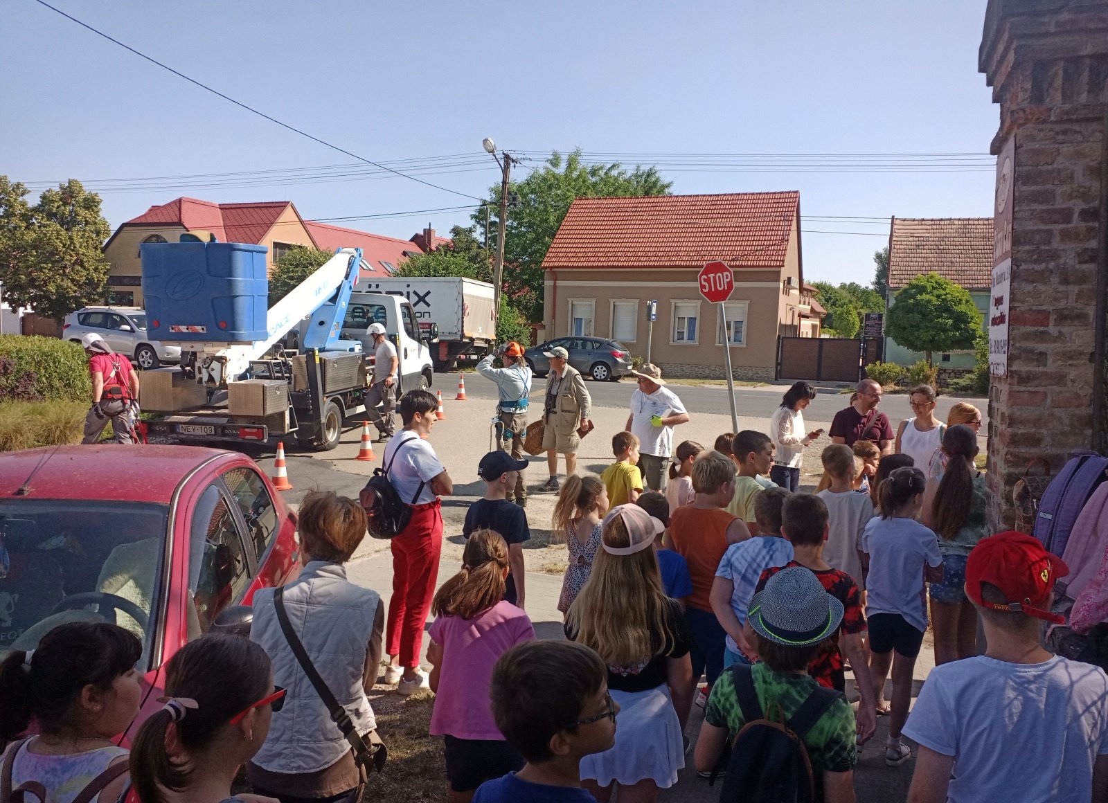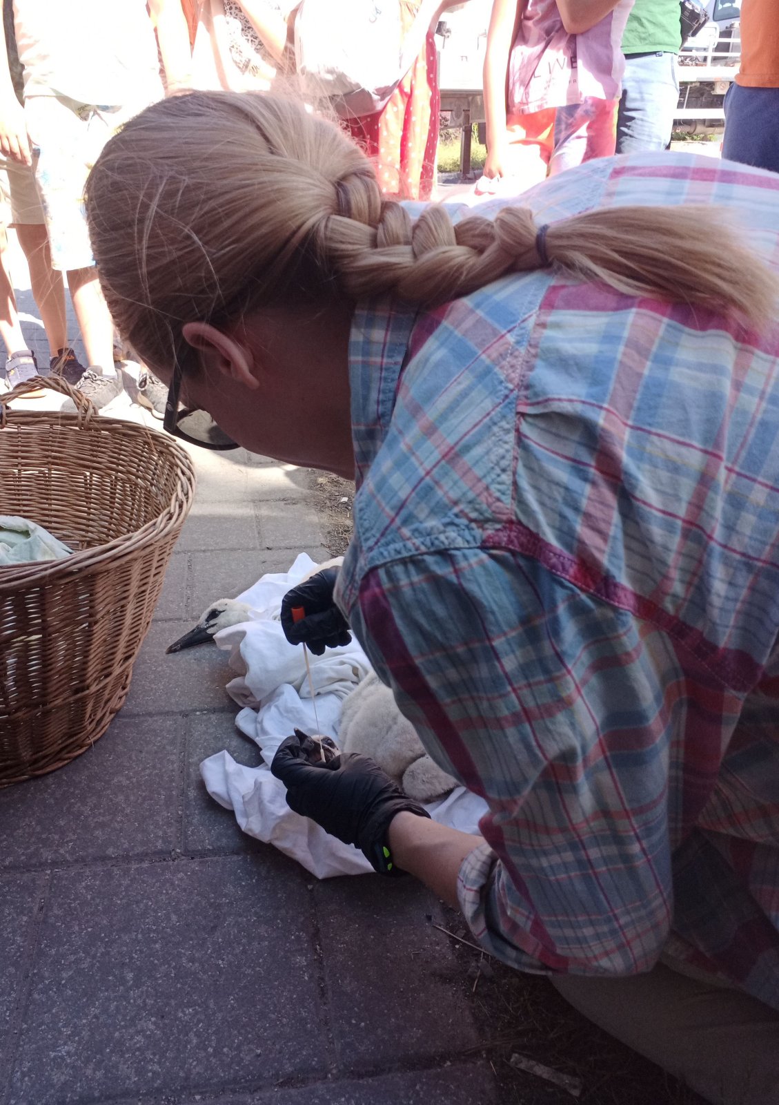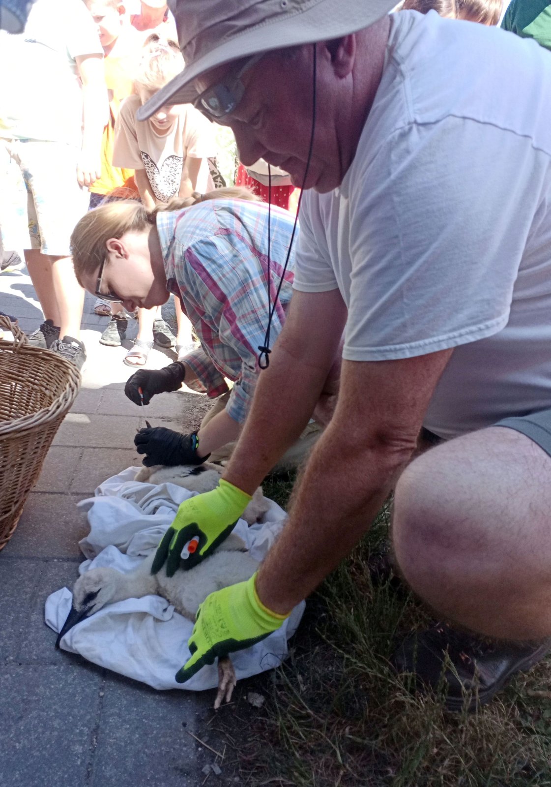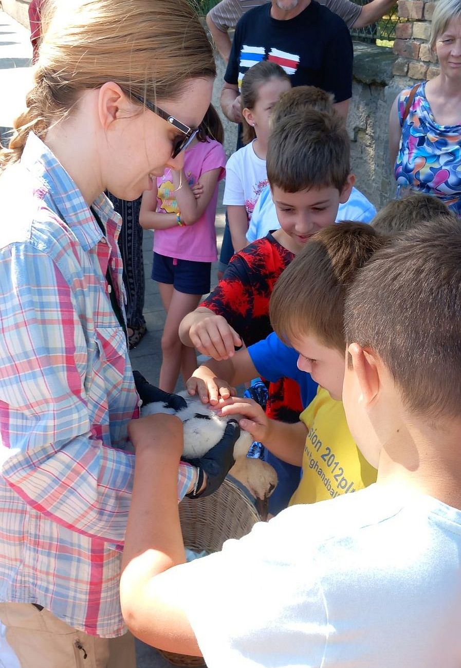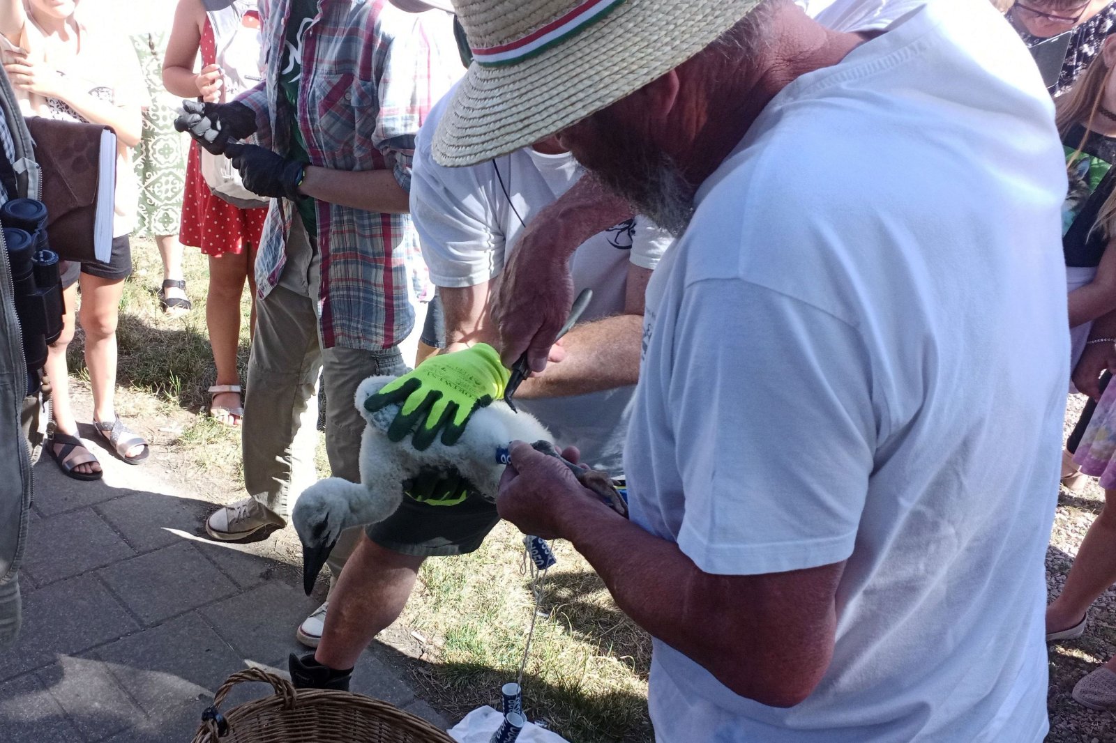 A Magyar Madártani Egyesület (MME) munkatársai minden év júniusában országszerte kiválasztanak és felkeresnek gólyafészkeket, hogy meggyűrűzzék az azévi fiókákat. Ezekre a gyűrűzésekre nyilvánosan, ún. látványgyűrűzés keretében, előre meghirdetett időpontokban kerül sor a kiválasztott településeken. A tudományos feladatok elvégzése mellett fontos az ismeretterjesztés, a bennünket körülvevő élő és élettelen környezet bemutatása, a helyi közösségek megismertetése az egyesület munkájával. Veszprém vármegyében az esemény ezekben a napokban zajlik, Pápa környékén június 20-án gyűrűzték a kis gólyákat. Népes közönség, szervezetten érkező iskolások, érdeklődő felnőttek várták a gyűrűzést végző csapatot a meghirdetett koradélelőtti időpontban a Közgáznál, a Teleki utca sarkán. Először az egyesület munkatársa mindenre kiterjedően, jól érthető módon mondta el, mit lehet majd látni és mit is szolgál mindez. Célzottan feltett kérdéseire adott válaszaikkal a gyerekek maguk világították meg a leglényegesebb tudnivalókat. A gyűrűzött madarak megfigyelésével pontosabb képet kaphatunk viselkedésükről, napi és hosszabb időszakot átölelő mozgásukról, táplálkozási szokásaikról és tavaszi-őszi költözésükről. Közben a gép kosara a fészekhez emelkedett, és fehér takaróba bugyolálva, egy nagy vesszőkosárban már a földre is hozták a két fiókát. Míg ketten a még fehér pihével borított kisgólyák csőréből és kloákájából mintát vettek különböző élettani vizsgálatokhoz, addig a MME többi munkatársa előkészítette a messziről is jól látható, nagy fehér számokkal ellátott sötétkék gyűrűket. Egy próbát követően véglegesen rögzítették a gólyák csűdjén és feljegyezték a gyűrűk adatait. Már csak a legjobban várt pillanat volt hátra, a gyerekek óvatosan megsimogathatták a kissé megszeppent madarakat. Aztán újra takaróba tekerték őket (mint megtudtuk, nehogy kiugorjanak a vesszőkosárból emelés közben) és már utaztak is vissza, fel a fészekbe. Pénteken a pápai fészken túl Tapolcafőn, Ihászon, Marcaltőn, Egyházaskeszőn, Kemenesszentpéteren, Magyargencsen, Kemeneshőgyészen, Marcalgergelyiben, Nemesszalókon, Nyárádon és Dákán talákozhattak gyűrűzőkkel az érdeklődők. A következő napok látványgyűrűzési programjának menetrendeje itt olvasható: https://mme.hu/hirek/2025/06/04/feher_golyak_latvanygyuruzese_2025