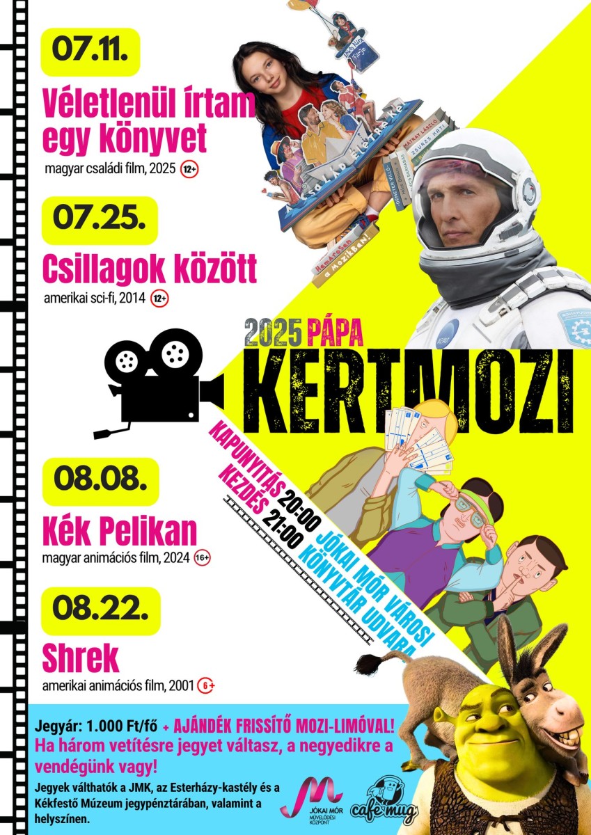 Idén nyáron ismét megrendezésre kerül a 2025-ös pápai kertmozi-sorozat, amelyet a Jókai Mór Művelődési Központ szervez. A vetítések helyszíne a Jókai Mór Városi Könyvtár udvara, ahol a nézők kényelmesen élvezhetik a filmeket. A sorozat július 11-én a "Véletlenül írtam egy könyvet" című magyar családi filmmel kezdődik, majd július 25-én a "Csillagok között" című sci-fi klasszikus következik. Augusztus 8-án a "Kék Pelikan" című új magyar animációs film, míg augusztus 22-én a népszerű "Shrek" zárja a nyári szezont. A vetítések minden alkalommal 21 órakor kezdődnek, és ajándék frissítő mozi-limó jár a jegyekhez, amelyek a JMK-ban, az Esterházy-kastélyban és a Kékfestő Múzeumban is megvásárolhatók.