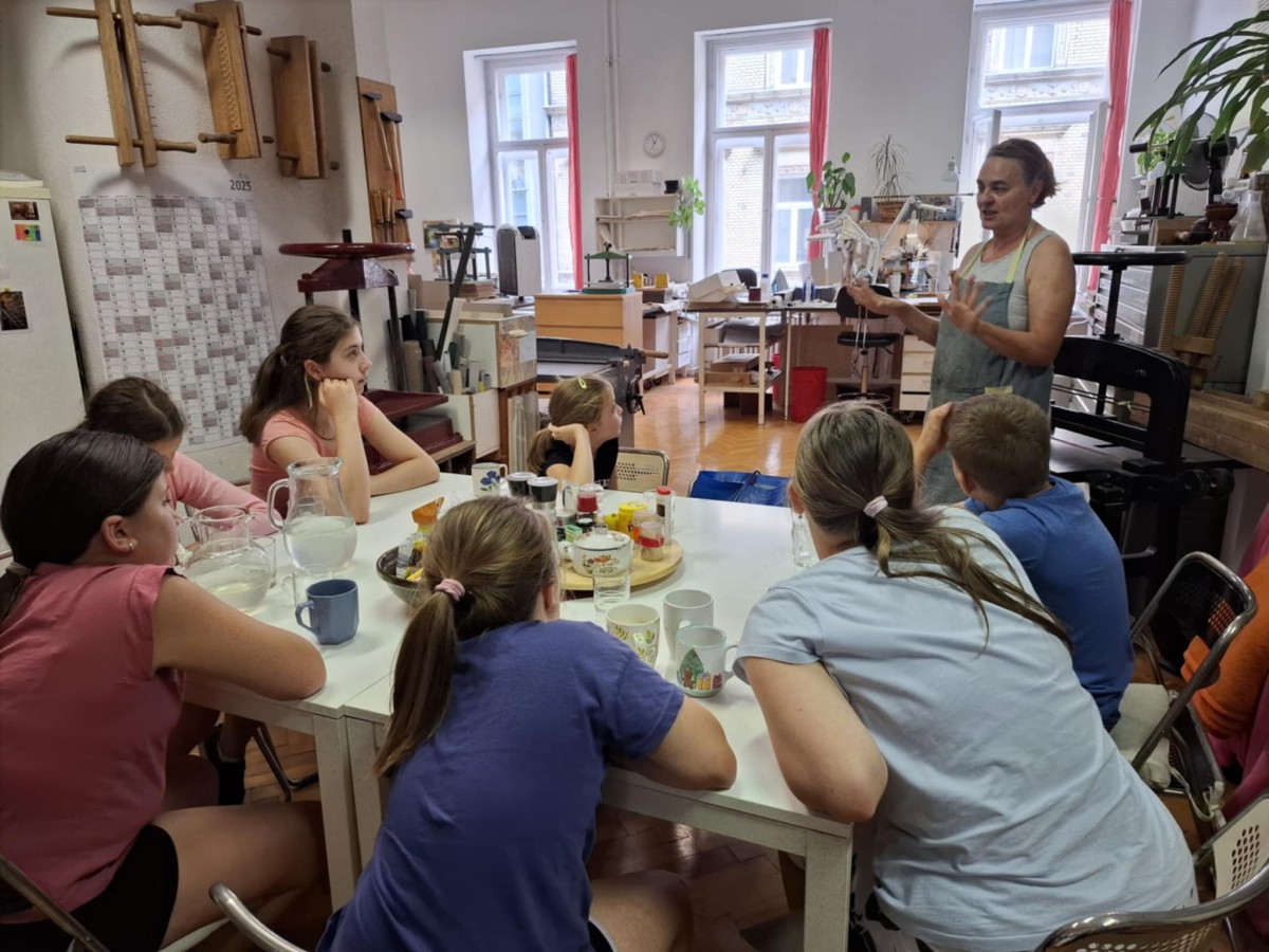 A szerdai nap egy különleges budapesti látogatással telt: a táborozók az ArchívArt restaurátor műhelybe látogattak el. Itt Gy. Molnár Kerstin restaurátor mutatta be, milyen finom és precíz munkát igényel egy régi könyv vagy dokumentum megmentése. A gyerekek első kézből láthatták, hogyan gyógyul meg egy megsárgult, megrepedt papírlap, és hogy egy könyv megőrzése néha épp olyan művészi munka, mint a megalkotása.