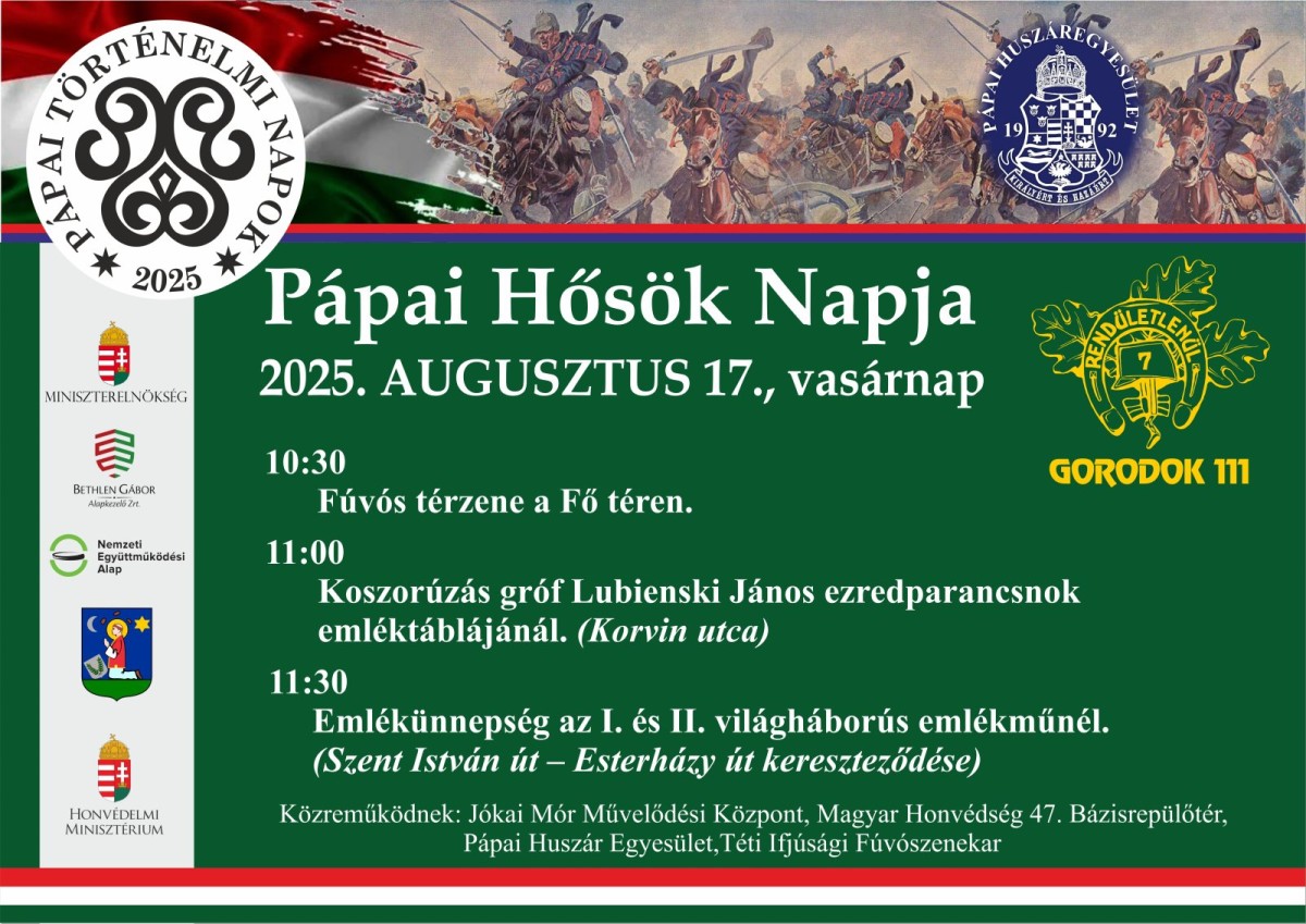 Pápán minden évben augusztus 17-én ünneplik a Hősök Napját, emlékezve a 7. Honvéd Huszárezred hősiességére az első világháborúban. Az ezred 1914. augusztus 17-én a gorodoki ütközetben súlyos veszteségeket szenvedett el, de a katonák bátorsága példaértékű volt. A megemlékezést a Pápai Huszár Egyesület, Pápa Város Önkormányzata és a Jókai Mór Művelődési és Szabadidő Központ közösen szervezi. Az idei program 10:30-kor kezdődik a Fő téren, fúvós térzenével, majd koszorúzással folytatódik gróf Lubienski János ezredparancsnok emléktáblájánál. Az esemény az I. és II. világháborús emlékműnél zárul, ahol a hősök tiszteletére ünnepélyes megemlékezést tartanak.