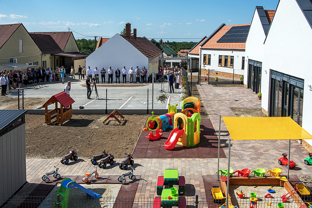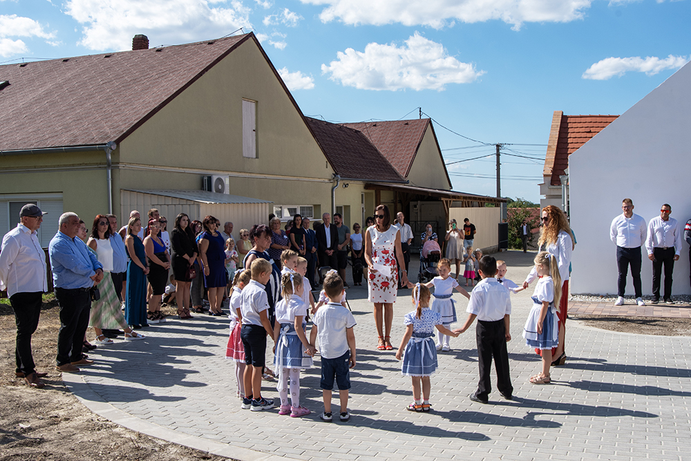 Az augusztus 25-én, az új épületegyüttes udvarán tartott rendezvényen Pajak Károly polgármester üdvözölte a falu lakóit, az óvoda dolgozóit és gyermekeit és a meghívott vendégeket. A településvezető hangsúlyozta, fejlesztési terveik között mindig prioritást élveznek a kisgyermekes családokat szolgáló beruházások, ezek mutatják a jövőbe vetett hitüket, ezek jelentik a falu jövőjét. A most záruló óvodafejlesztés és bölcsődeépítés nemcsak összegében a legnagyobb projekt e téren, hanem a legjelentősebb is, hiszen eddig nem volt bölcsődéje a településnek. A polgármester köszönetet mondott Magyarország kormányának, a projektet támogató politikusoknak - dr. Kontrát Károlynak, dr. Kovács Zoltánnak -, a megvalósításban résztvevőknek és az óvoda munkatársainak is. Kiemelte azt is, nemcsak a fejlesztés megvalósítása nagy eredmény, hanem az is, hogy a község óvodája immár 50 éve működik és folyamatosan fejlődött az elmúlt években.A jeles jubileumot az intézmény apróságainak kedves műsorával és Szekér Lászlóné volt óvodavezető, illetve Mészáros Brigitta egykori óvodás szavaival ünnepelték.