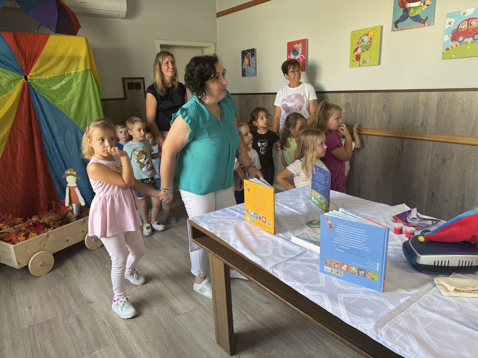 2024-ben indult útjára ez a vándorkiállítás, amikor a könyvsorozat és ez a pedagógiai módszer is 15 éves volt - mondta Szabadi Melinda óvodapedagógus a Kerekítő Manó Világa című kiállítás megnyitóján. Mivel a Mezőlaki Tengelic Természetvédő Óvoda 2017. óta kerekítős mintaintézmény, ezért is fontos állomása a vándorkiállításnak. A gyerekek megismerkedhetnek Kerekítő Manó világával, egy interaktív utazás keretében különböző játékos feladatokat kell majd megoldaniuk, és ezek segítségével ismerhetik meg mind a könyveknek a képeit, illetve magát azt a világot, amiben Kerekítő Manó él - mondta el a Médiacentrum kérdésére Szabadi Melinda. Maga a kiállítás a könyvsorozatra épül, vannak itt népi mondókákat tartalmazó könyvek, illetve Évkerék található benne, amely a jelesnapokra való felkészülést segíti elő. A megnyitóra nemcsak az óvodásokat hívták, hanem a nemrég volt ovisokat is az iskolából. Senye Ilona képi és kifejezéspszichológiai szaktanácsadó meseterapeuta nyitotta meg a kiállítást, elbeszélgetve a gyerekekkel. Én képzeljétek, úgy ismertem meg Melcsi nénit, hogy egyszer eljött egy mesét hallgatni, éppen én meséltem. Aztán nem ment haza, hanem meghallgatott még egyet, meg még egyet. Egy ember, aki ennyire szereti a mesét hallgatni is, tovább mesélni meg olvasni, az biztos, hogy csak mesekedvelő ember lehet - mondta Senyi Ilona a gyerekeknek. A mezőlaki óvodában Kerekítő Manó nem csak egy játékbáb, hanem csoporttag, az óvónők a napi gyakorlatban használják a kerekítős módszertant. Maga a kerekítős módszertan tulajdonképpen már nem csak egy baba-mama foglalkozáshálózat, hanem egy élménypedagógiai módszer, illetve egy pedagógusképzés, amelyből most már az óvodák, illetve a bölcsődék is meríthetnek. A gyermekeknek nagyon fontos maga a mondókázás, hiszen a mai világunkban szükségük van ezekre az érzésekre, nagyon sok tapasztalatot szerezhetnek belőle, és én azt gondolom, hogy ezért is nagyon jó és nagyon fontos, hogy a gyerekek ezt a világot is megismerjék. A megnyitó után az ovisok és az alsósok megnézték a kiállítást és rajzoltak, játszottak a módszertani foglalkozások alapján.