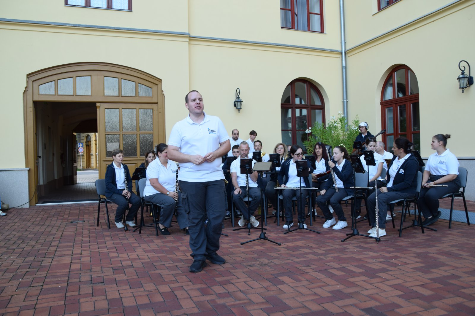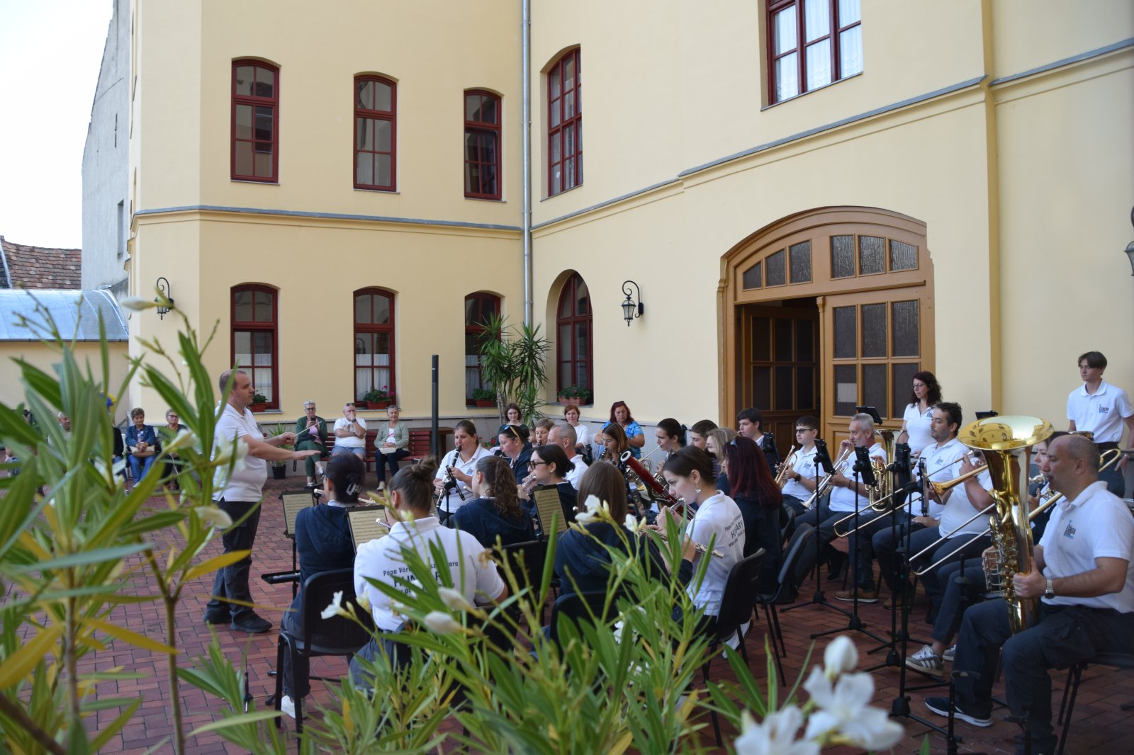 Különleges zenei élménnyel zárta a nyarat a zenekedvelő közönség Pápán: a Rendhagyó Nyitott Kapuk programsorozat részeként a Pápai Református Teológiai Akadémia udvarán adott koncertet Pápa Város Fúvószenekara.