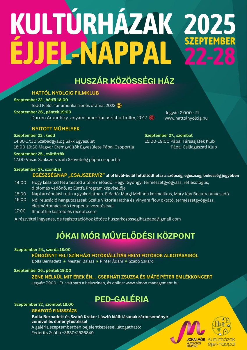Szeptember 22. és 28. között ismét megrendezésre kerül a Kultúrházak Éjjel-Nappal programsorozat, amelyhez Pápa városának kulturális intézményei is csatlakoznak. A Huszár Közösségi Ház, a Jókai Mór Művelődési Központ és a Ped-Galéria számos programmal várja az érdeklődőket, köztük filmklubokkal, sakkfoglalkozásokkal és emlékkoncertekkel. Különleges eseményként szeptember 27-én Egészségnapot tartanak, ahol a szépség és egészség témáit járják körül, ingyenes, de regisztrációhoz kötött programokkal. A Jókai Mór Művelődési Központban szeptember 24-én nyílik meg a Függönyt fel! című színházi fotókiállítás, míg a Ped-Galériában szeptember 27-én a Grafotó című kiállítás finisszázsát rendezik meg. A programsorozat célja, hogy minden korosztály számára színes és változatos kulturális élményeket kínáljon.