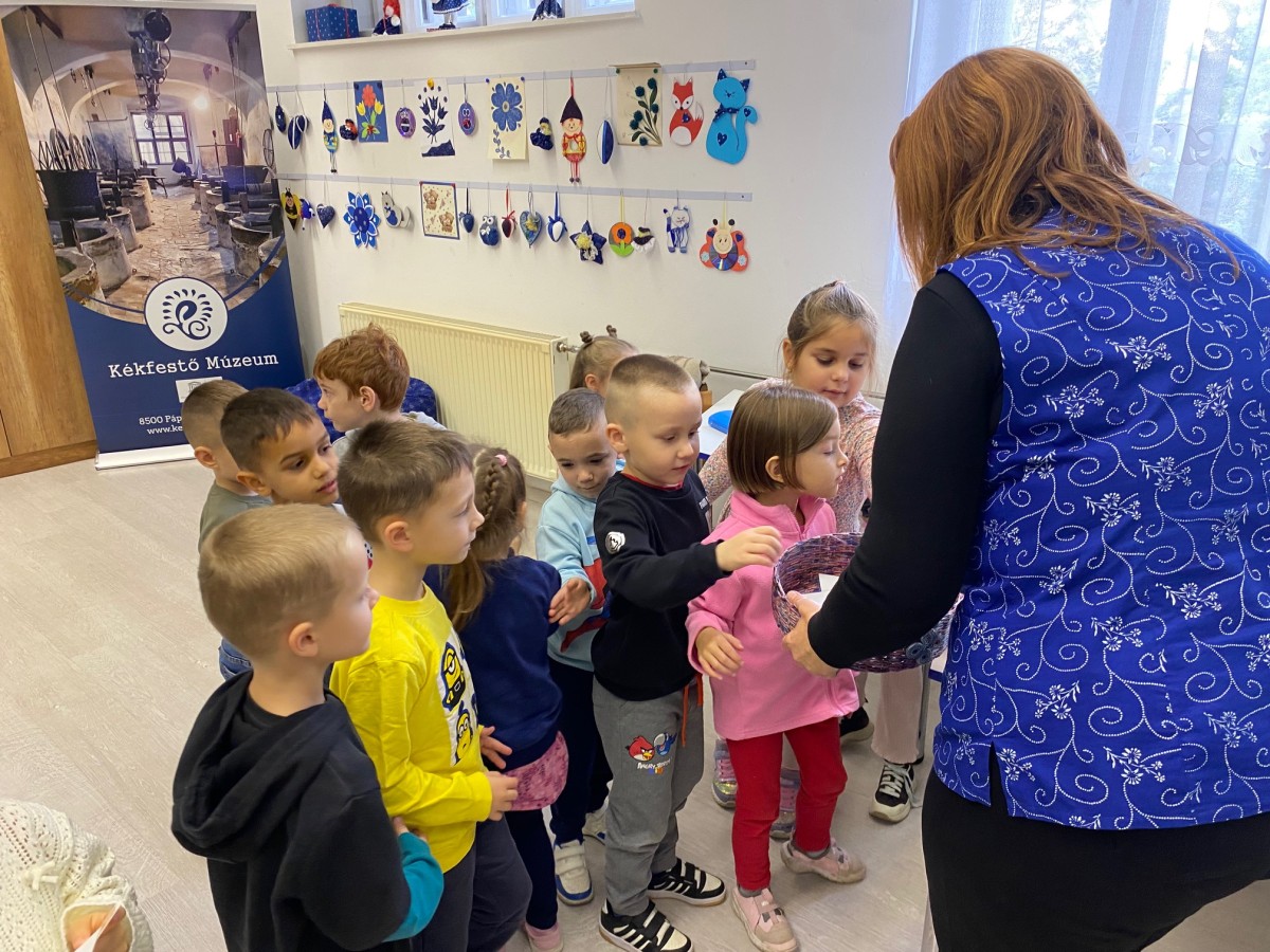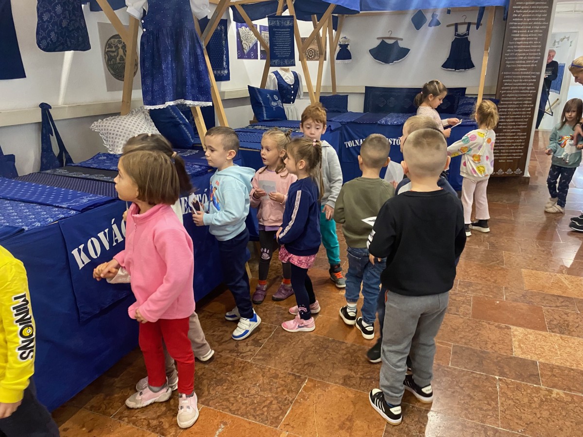 A mese után izgalmas, játékos feladatok következtek. Az ovisok először a mintafákat és a hozzájuk tartozó nyomatokat párosították össze, majd egy kis nyomozásra indultak a kiállításban: különböző mintákat és tárgyakat kellett megkeresniük. Közben együtt figyelték meg és beszélték meg, milyen gyönyörű motívumok díszítik a kékfestő textíliákat, és hányféle módon lehet ezeket az anyagokat felhasználni.