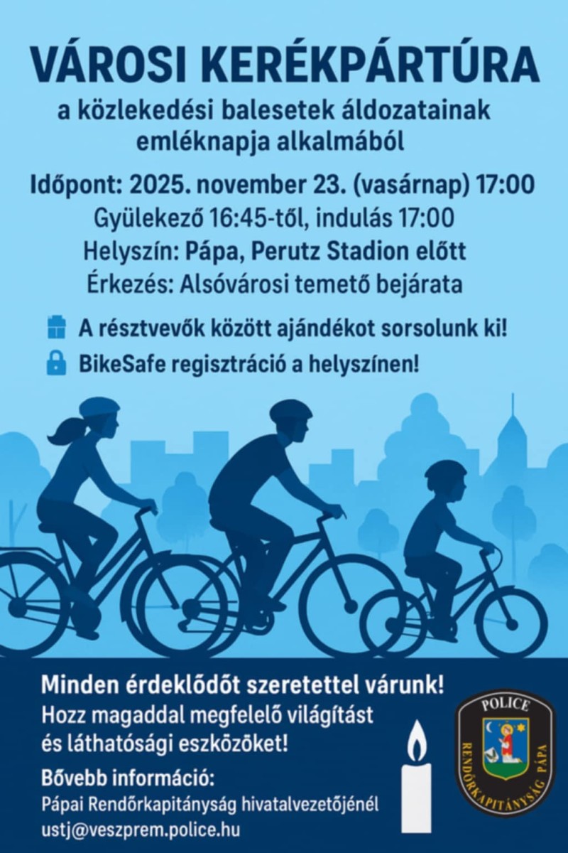 Pápán 2025. november 23-án, vasárnap 17 órakor rendezik meg a közlekedési balesetek áldozatainak emléknapjához kapcsolódó városi kerékpártúrát. A rendezvény célja, hogy méltó módon emlékezzenek meg a balesetek áldozatairól és felhívják a figyelmet a közlekedésbiztonságra. A gyülekező 16:45-től a Perutz Stadion előtt lesz, ahonnan a menet 17 órakor indul az Alsóvárosi temetőig. A szervezők ajándéksorsolással készülnek, és a helyszínen BikeSafe regisztrációra is lehetőség nyílik. A részvétel nyitott minden érdeklődő számára, de a rendőrség kéri, hogy a résztvevők hozzanak magukkal megfelelő világítást és láthatósági felszerelést.