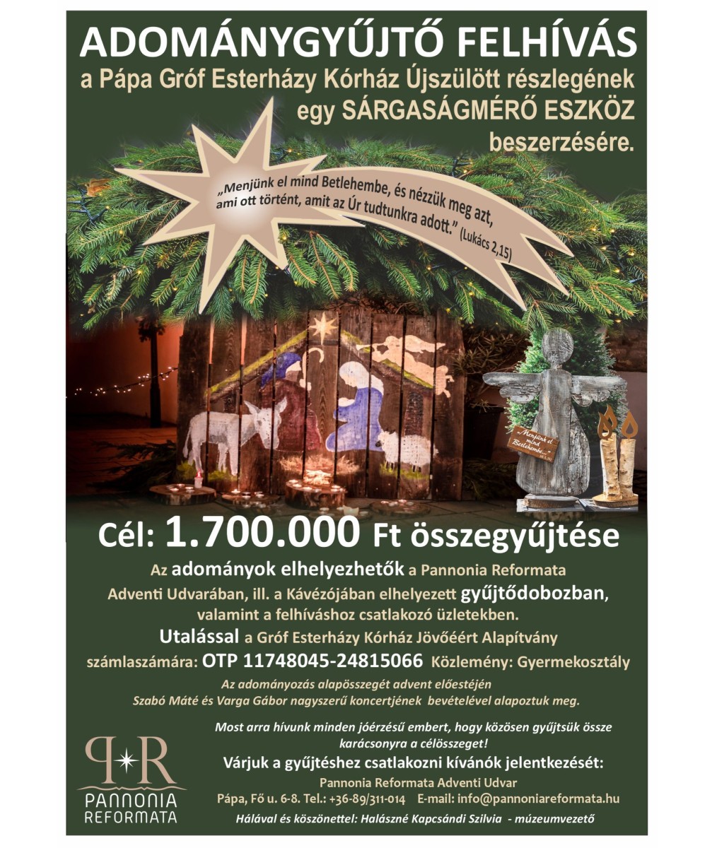 A Pannonia Reformata Múzeum adventi adománygyűjtő akciót indított, hogy sárgaságmérő készüléket vásároljon a pápai kórház újszülöttosztályának. Az ötlet a múzeum által szervezett jótékonysági koncert után merült fel, amelynek bevételét a gyermekosztály javára ajánlották fel. Halászné Kapcsándi Szilvia, a múzeum vezetője, hangsúlyozta a közösségi összefogás fontosságát, míg dr. Bilinszky Zsuzsanna osztályvezető főorvos elmagyarázta a sárgaságmérő készülék előnyeit a fájdalmas vérvétellel szemben. Az akcióhoz több intézmény és vállalkozó is csatlakozott, és az adományokat a múzeum udvarán elhelyezett gyűjtődobozban várják. Az adományozás lehetősége mellett banki utalással is támogathatják a Gróf Esterházy Kórház Jövőjéért Alapítványt.