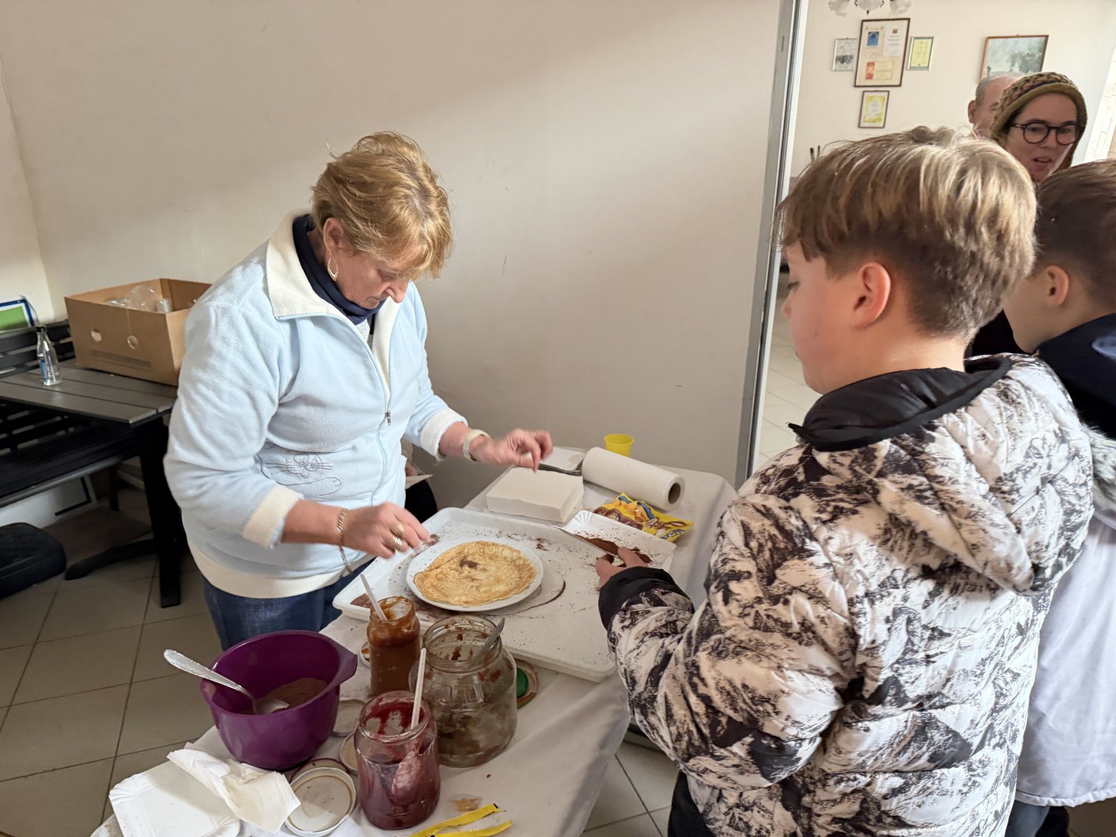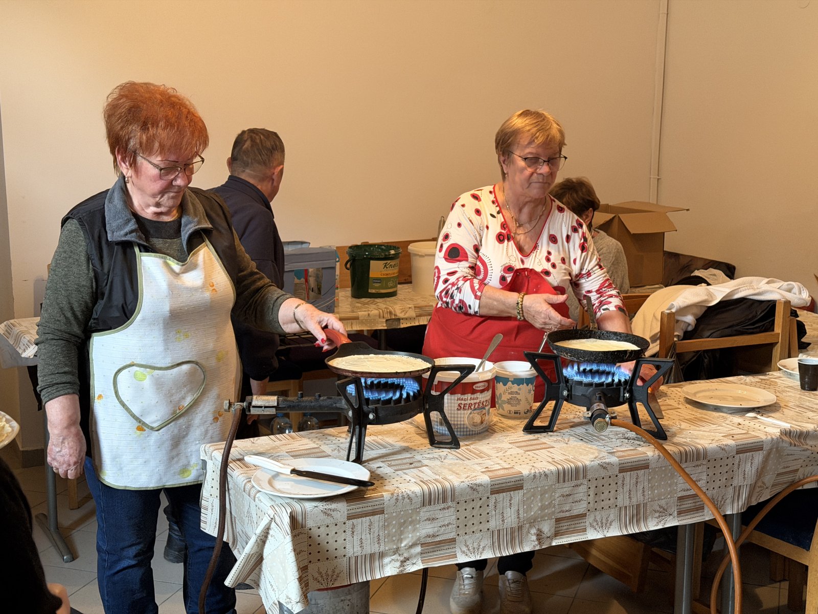 A nyugdíjas egyesület irodája előtt tábla hirdette az utcán, hogy megnyílt a Palacsinta Udvar. Nemcsak, hogy megnyílt, de meg is telt, méghozzá sok sok palacsintát falatozó gyerekkel és bizony felnőttel is. Baán Éva a nyugdíjas egyesület elnöke elmondta, hogy a nyári nagy siker után úgy gondolták, hogy az adventben is megédesítik a pápaiak életét és minden betérőt megkínálnak palacsintával. 5 serpenyőben folyamatosan készültek a finomságok, de csak egy féle tésztából. Van egy nyugdíjasunk a Fehér Viola - mondta Baán Éva, aki kitűnő háziasszony, ő a fő keverő, a tagtársak pedig sütik. Szerencsére gondosan előkészültek a nagy mennyiségű sütéshez, mert nem sokkal a kezdés után jöttek is az iskolások és a járókelők a finomságokra. Ahogy ilyenkor lenni szokott volt kakaós ízesítés, különféle lekváros, amit a nyugdíjasok hoztak be és persze egy kis forró tea is. Természetesen a főszakácstól megkérdeztük a jó palacsinta tészta titkát. Simára kell kikeverni, ez a lényege - mondta Fehér Viola. Ha szeretnénk, hogy ne ragadjon, akkor ne tegyünk bele cukrot. Viola tojásporral készíti a palacsintát a könnyebb kezelhetőség érdekében. A legszerényebb becslések szerint 400-450 db palacsinta készült kedd délután a nyugdíjas egyesület jóvoltából.