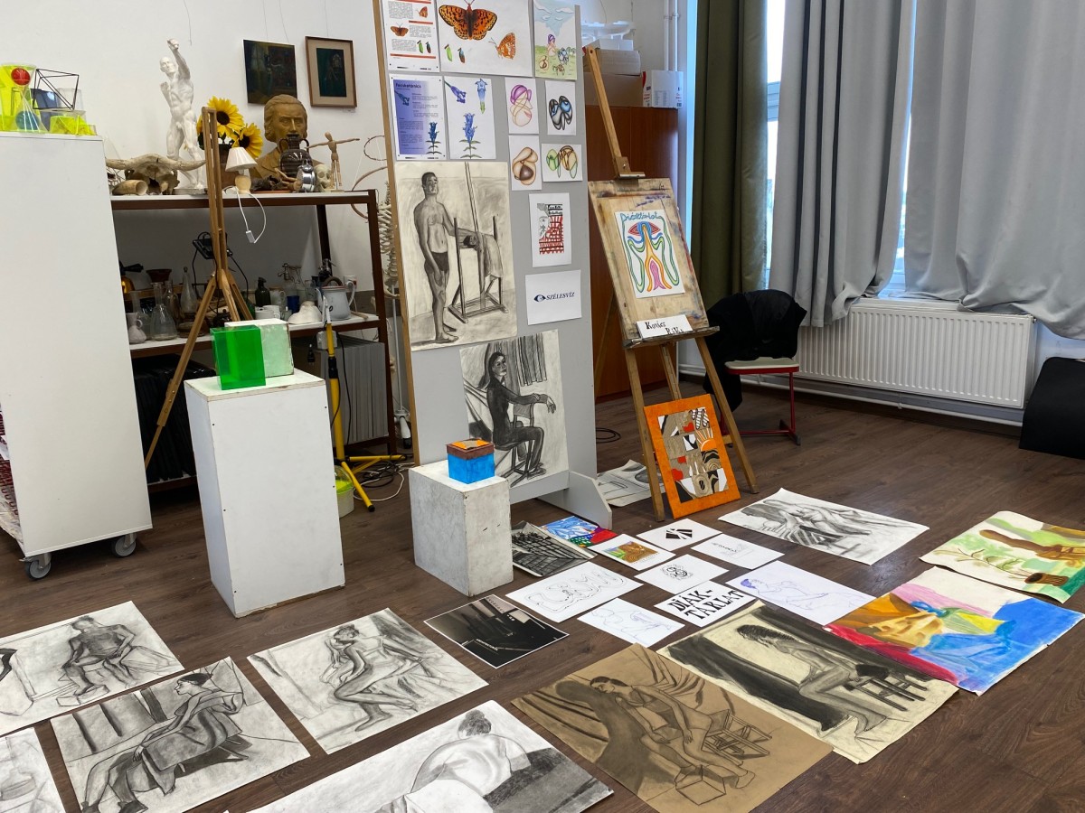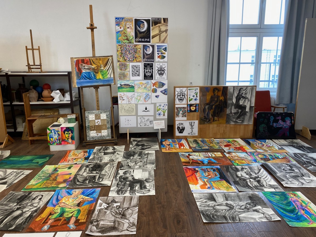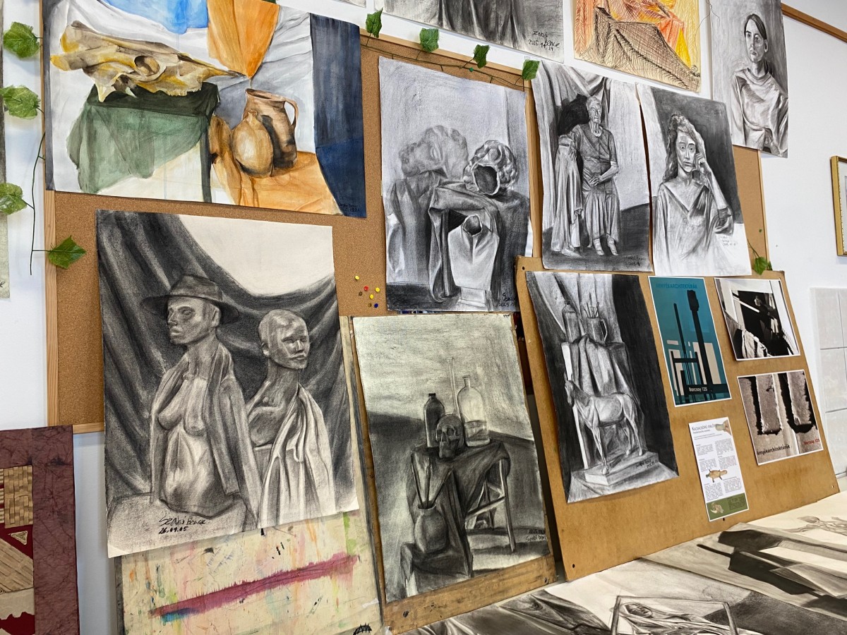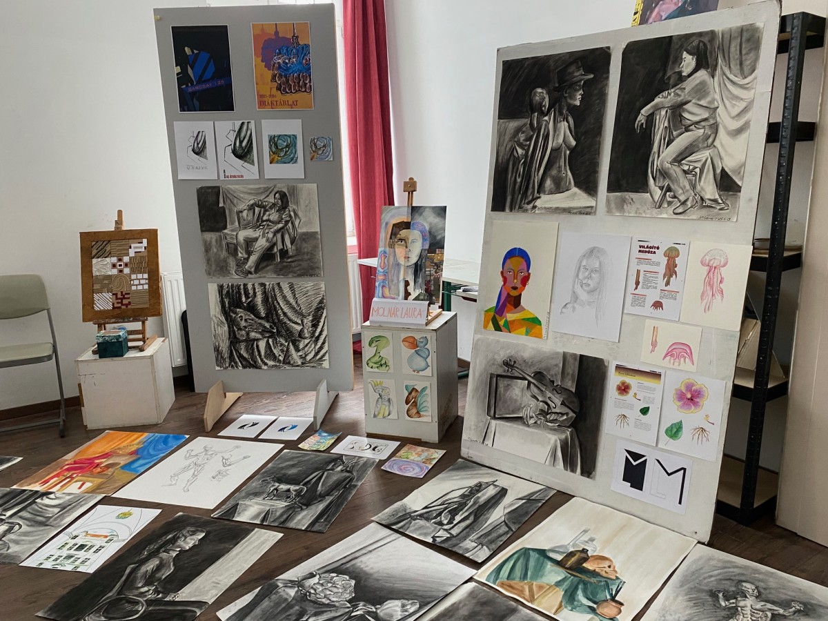 A bemutatott alkotások technikailag és tematikailag is rendkívül változatosak. A tanulmányrajzoktól a szén- és pasztelltechnikán át a grafikai munkákig sokféle megoldás jelenik meg, beleértve a digitális technikákat is. A diákok már olyan szinten alkalmazzák a korábban tanult módszereket, hogy azok akár gyakorlati felhasználásra - például logó- vagy plakáttervezésre - is alkalmasak..jpg)
