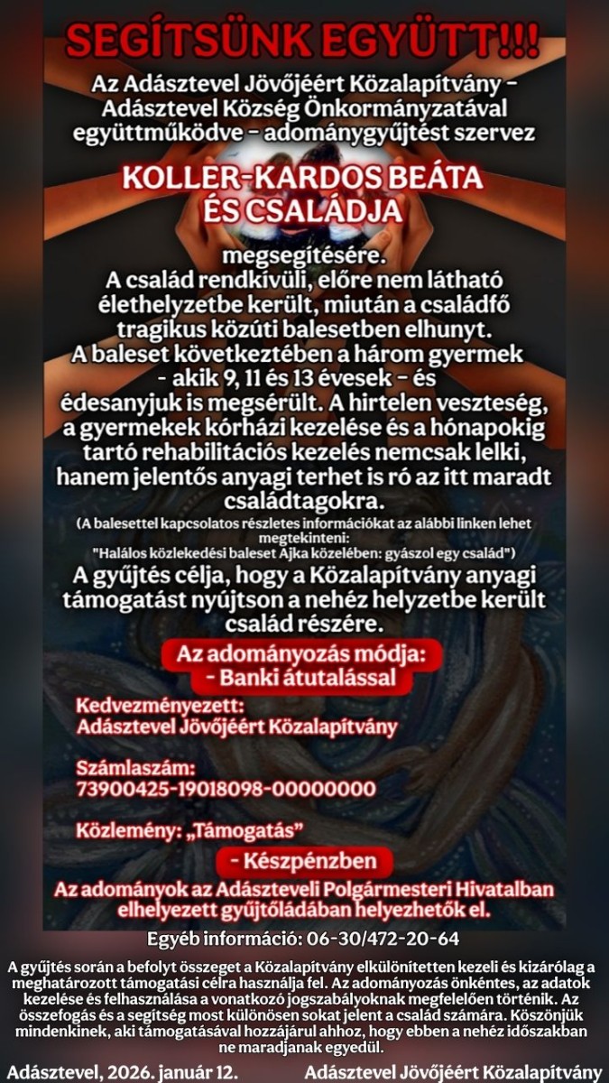 A tragédia után sokan igyekeznek segíteni az itt maradt családon. Fodor Béla, Adásztevel polgármestere kedden tette közzé azt a felhívást, amely szerint az Adásztevel Jövőjéért Közalapítvány az önkormányzattal együttműködve adománygyűjtést szervez Koller-Kardos Beáta és családja támogatására.
