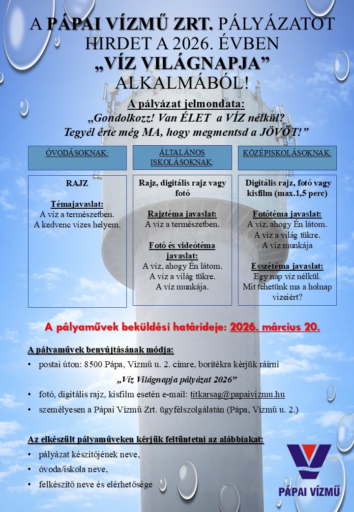 A Pápai Vízmű Zrt. 2026-ban pályázatot hirdet a Víz Világnapja alkalmából, amelyre óvodások, általános iskolások és középiskolások jelentkezését várják. A pályázat célja, hogy a fiatalok kreatívan gondolkodjanak a víz fontosságáról és védelméről, jelmondata pedig: „Gondolkozz! Van ÉLET a VÍZ nélkül? Tegyél érte még MA, hogy megmentsd a JÖVŐT!” Az óvodások rajzokkal, az általános iskolások rajzokkal, digitális rajzokkal vagy fotókkal, míg a középiskolások digitális rajzzal, fotóval vagy legfeljebb 1,5 perces kisfilmmel nevezhetnek. A pályaművek beküldési határideje 2026. március 20., és a munkákon fel kell tüntetni a pályázó nevét, az intézmény nevét és a felkészítő elérhetőségét. A szervezők remélik, hogy a pályázat hozzájárul a környezettudatos gondolkodás erősítéséhez és felhívja a fiatalok figyelmét a víz megóvásának fontosságára.