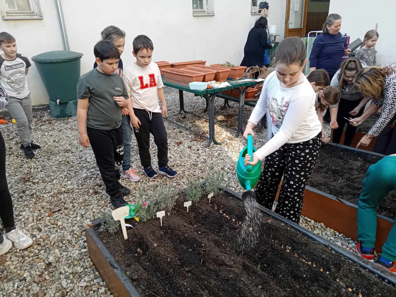 Az iskola három osztályának tanulói közösen ültettek zöldségeket az intézmény kertjében. A gyerekek nagy lelkesedéssel fogtak munkához: a földbe került többek között zöldborsó, saláta és dughagyma is.