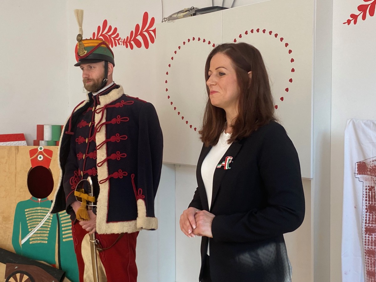 Az ünnep egyik különleges vendége Tóth Gergő, a Pápai Huszáregyesület tagja volt, aki huszárviseletben érkezett az óvodába. A gyerekek közelről is megnézhették az egyenruhát, és megtudhatták, milyen ruhadarabokból áll a huszárok viselete, valamint arról is hallhattak, milyen szerepük volt a huszároknak a történelemben. .jpg)