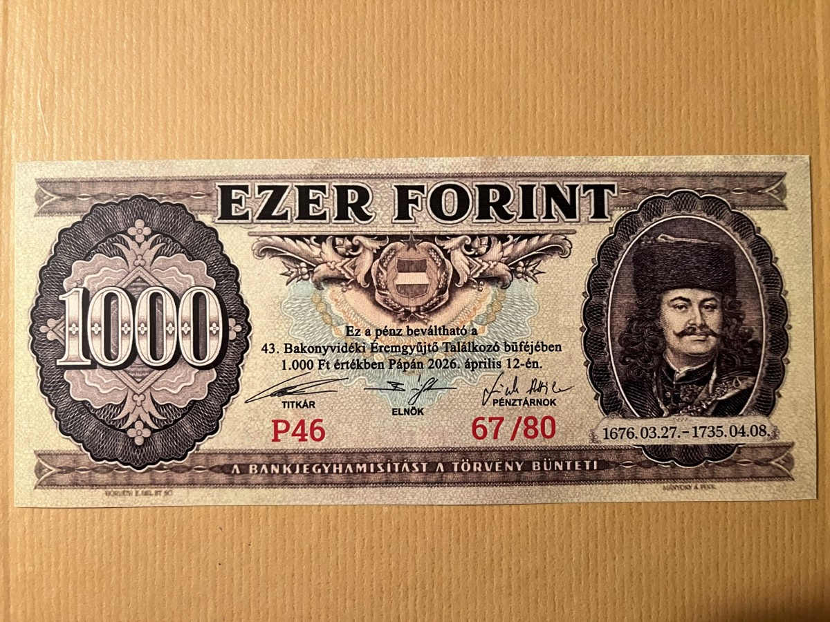 A Magyar Éremgyűjtők Egyesülete Pápai Csoportja hosszú ideje készít ezekre a találkozókra alkalmi pénzeket, amelyek egyébként a rendezvény büféjében beváltható pénzek. Az idei már a 46. volt a sorban. Mindig keresnek valami eseményt, személyt, évfordulót, akit, vagy amit megjelenítenek ezeken. Idén II. Rákóczi Ferenc születésének 350. évfordulója ihlette a tervezést. Ennek alapja az 1949 és 1989 között használt, Rákóczit ábrázoló 50 Forintos bankjegy volt, de a hátoldalára Pápa várának képe került, ami 1705 és 1707 között Bottyán János tábornok főhadiszállása volt a Rákóczi-szabadságharc alatt.