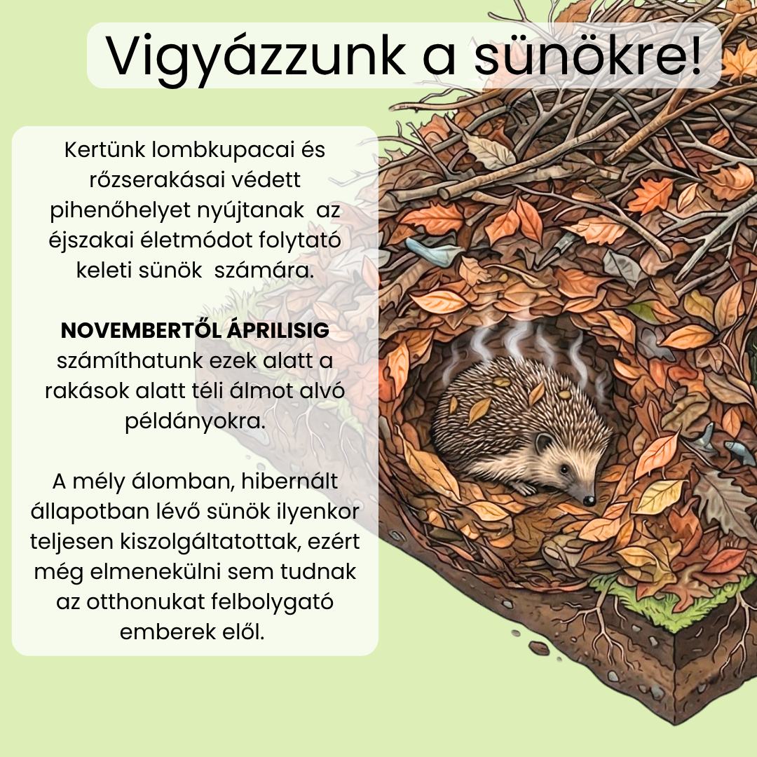 A Magyar Madártani és Természetvédelmi Egyesület ezért arra figyelmeztet, hogy mielőtt nekiesnénk egy lombkupacnak vagy rőzserakásnak, mindig győződjünk meg arról, nem rejtőzik-e alatta kisállat. Érdemes a halmot óvatosan, rétegenként megbontani, és különösen figyelni az alsó részeknél. A sünök ugyanis veszély esetén összegömbölyödnek, és a rájuk tapadó levelek miatt szinte észrevétlenné válnak.